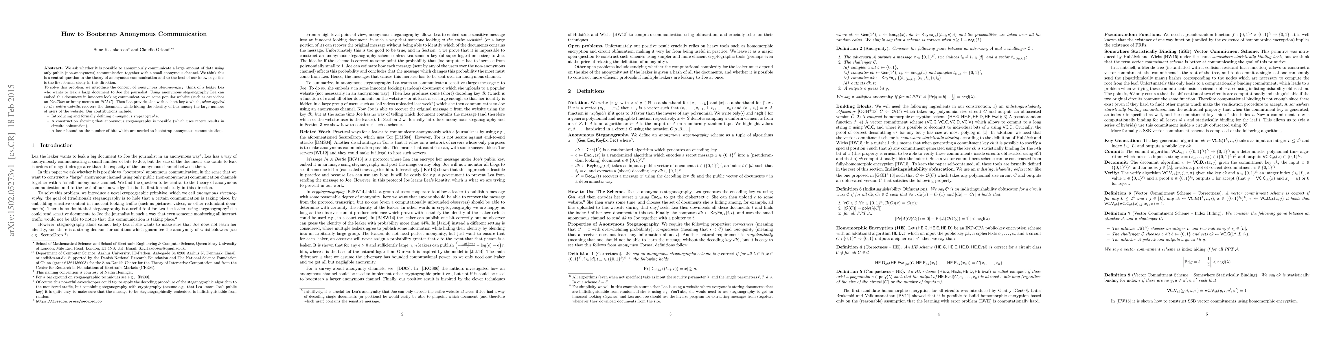 The introduction of anonymous steganography, a protocol construction using circuit obfuscation, and a lower bound analysis for bootstrapping anonymous communication.