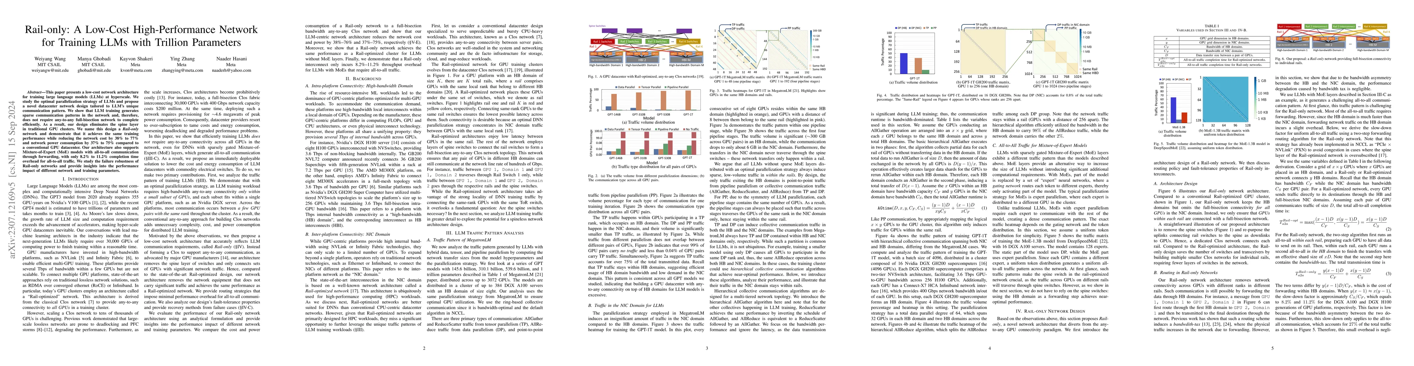 This paper proposes a low-cost network architecture for training Large Language Models by optimizing communication patterns, achieving near-optimal performance while reducing network costs by 37% to 75% compared to traditional any-to-any networks. The new architecture uses high-bandwidth domains to connect only necessary GPU groups.