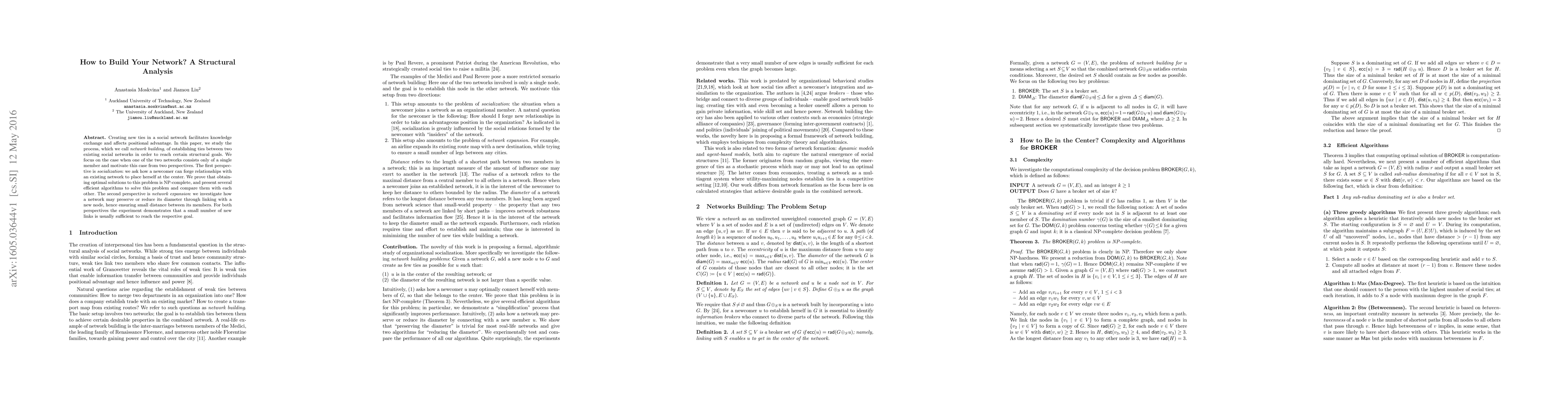Creating new ties in a social network facilitates knowledge exchange and affects positional advantage. In this paper, we study the process, which we call network building, of establishing ties between two existing social networks in order to reach certain structural goals. We focus on the case when one of the two networks consists only of a single member and motivate this case from two perspectives. The first perspective is socialization: we ask how a newcomer can forge relationships with an existing network to place herself at the center. We prove that obtaining optimal solutions to this problem is NP-complete, and present several efficient algorithms to solve this problem and compare them with each other. The second perspective is network expansion: we investigate how a network may preserve or reduce its diameter through linking with a new node, hence ensuring small distance between its members. We give two algorithms for this problem. For both perspectives the experiment demonstrates that a small number of new links is usually sufficient to reach the respective goal.