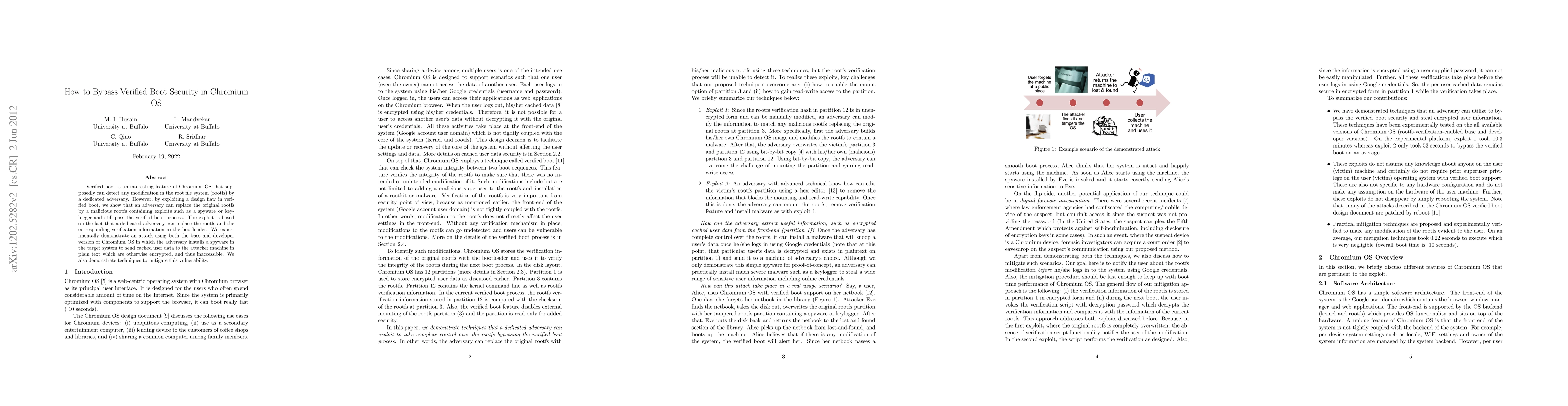 This paper explores a design flaw in the verified boot mechanism of Chromium OS, demonstrating how an adversary can replace the legitimate root file system with a malicious one, bypassing the verification process. The authors provide an experimental proof of concept showing the installation of spyware that sends encrypted user data in plain text, and propose mitigation techniques to address this vulnerability.