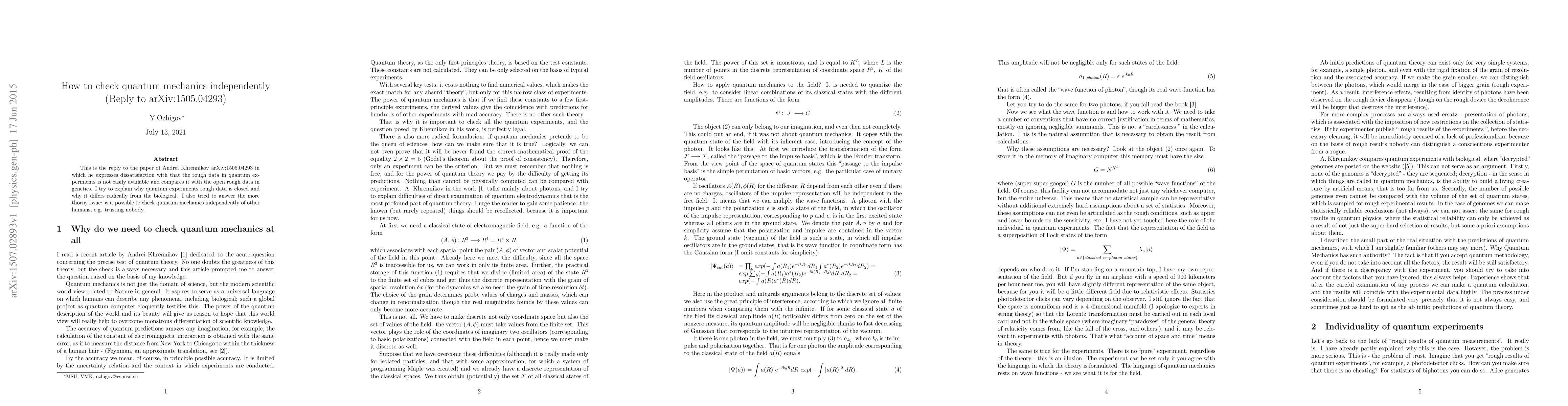 This paper responds to Andrei Khrennikov's critique on the lack of accessible rough data in quantum experiments, explaining why such data is not publicly available and differs fundamentally from open genetic data. It also addresses the challenge of independently verifying quantum mechanics without relying on human consensus.