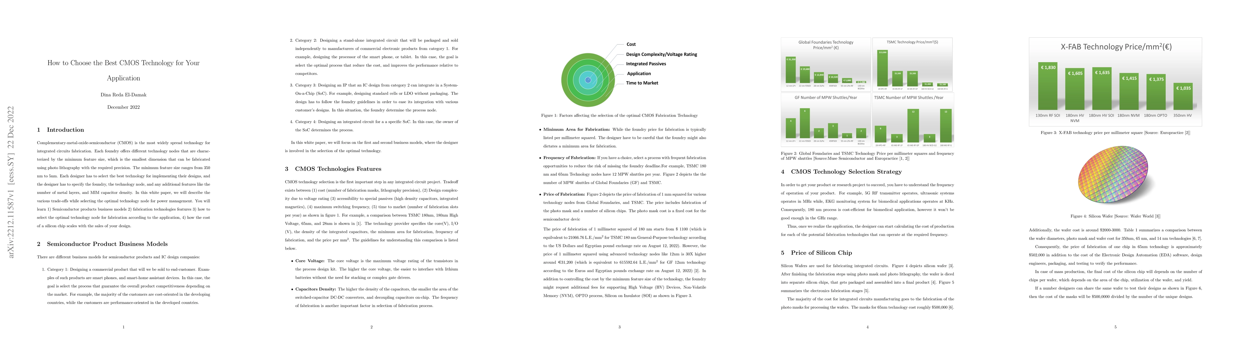 This paper discusses selecting the best CMOS technology for integrated circuit fabrication, focusing on the trade-offs between various technology nodes. It covers business models, fabrication features, optimal technology node selection for power management, and the cost scaling of silicon chips with design sales.