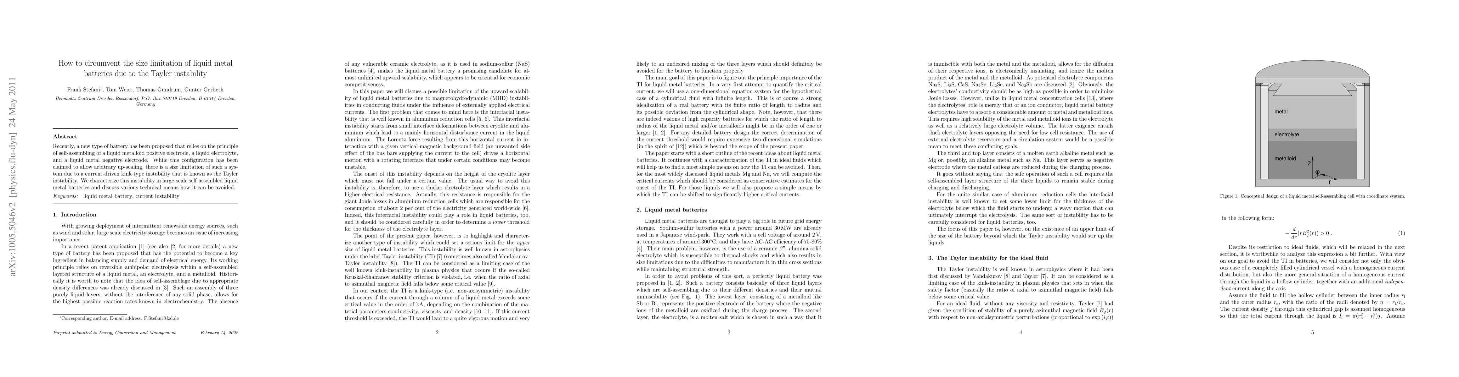 This paper investigates the Tayler instability limiting the size of liquid metal batteries and proposes technical solutions to circumvent this issue, enabling the potential for scalable battery designs. Various methods to avoid the instability are discussed to enhance the practical application of large-scale liquid metal batteries.
