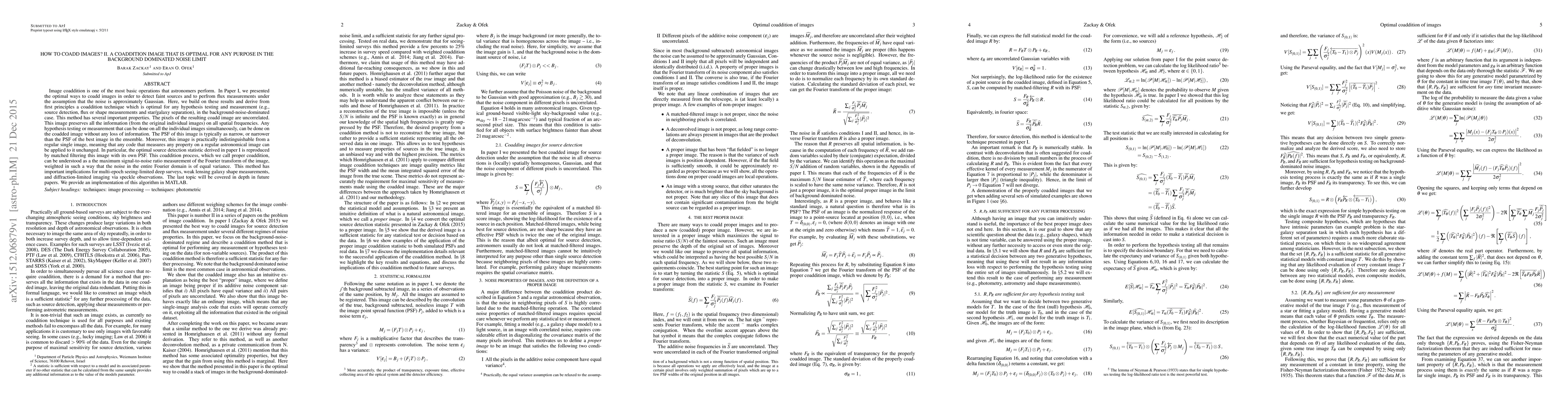 Image coaddition is one of the most basic operations that astronomers perform. In Paper~I, we presented the optimal ways to coadd images in order to detect faint sources and to perfrom flux measurements under the assumption that the noise is approximately Gaussian. Here, we build on these results and derive from first principles a coaddition technique which is optimal for any hypothesis testing and measurement (e.g., source detection, flux or shape measurements and star/galaxy separation), in the background-noise-dominated case. This method has several important properties. The pixels of the resulting coadd image are uncorrelated. This image preserves all the information (from the original individual images) on all spatial frequencies. Any hypothesis testing or measurement that can be done on all the individual images simultaneously, can be done on the coadded image without any loss of information. The PSF of this image is typically as narrow, or narrower than the PSF of the best image in the ensemble. Moreover, this image is practically indistinguishable from a regular single image, meaning that any code that measures any property on a regular astronomical image can be applied to it unchanged. In particular, the optimal source detection statistic derived in paper~I is reproduced by matched filtering this image with its own PSF. This coaddition process, which we call proper coaddition, can be understood as a the maximum signal-to-noise ratio measurement of the Fourier transform of the image, weighted in such a way that the noise in the entire Fourier domain is of equal variance. This method has important implications for multi-epoch seeing-limited deep surveys, weak lensing galaxy shape measurements, and diffraction-limited imaging via speckle observations. The last topic will be covered in depth in future papers. We provide an implementation of this algorithm in MATLAB.