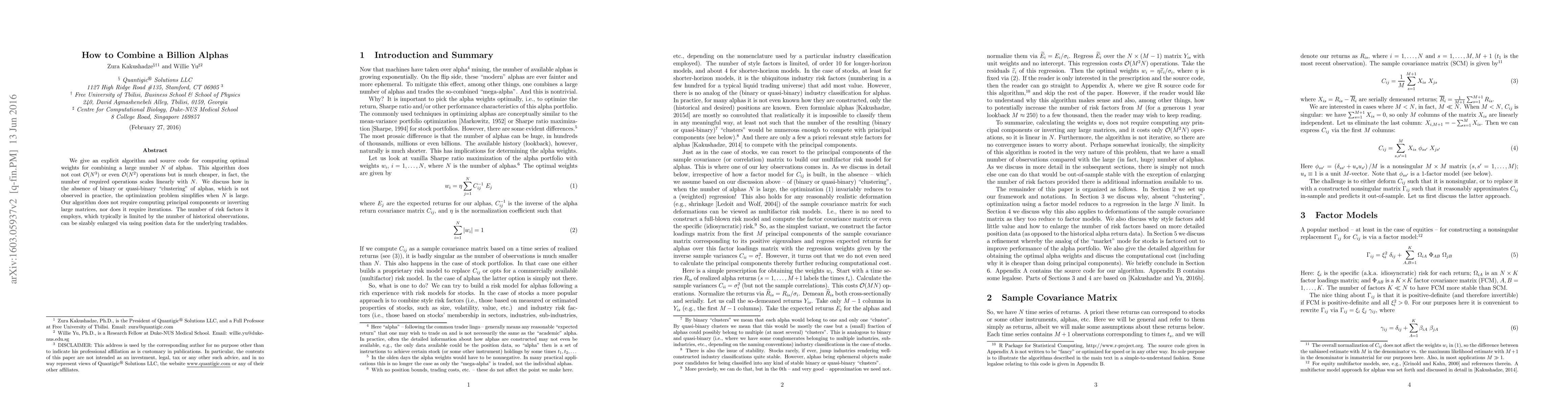 The paper introduces an efficient algorithm for computing optimal weights in combining a large number of alphas, which does not rely on matrix inversion or iterations, and scales linearly with the number of alphas.