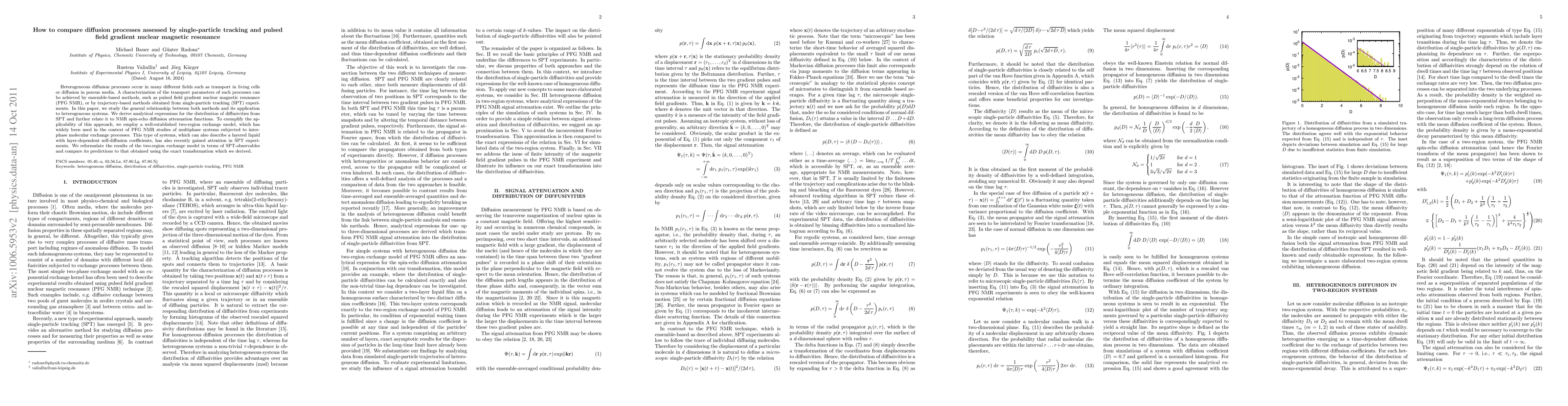 This paper compares diffusion processes characterized by single-particle tracking (SPT) and pulsed field gradient nuclear magnetic resonance (PFG NMR), deriving analytical expressions for SPT diffusivity distributions and relating them to NMR diffusion attenuation functions. It applies these methods to a two-region exchange model, demonstrating the applicability of SPT in heterogeneous systems.