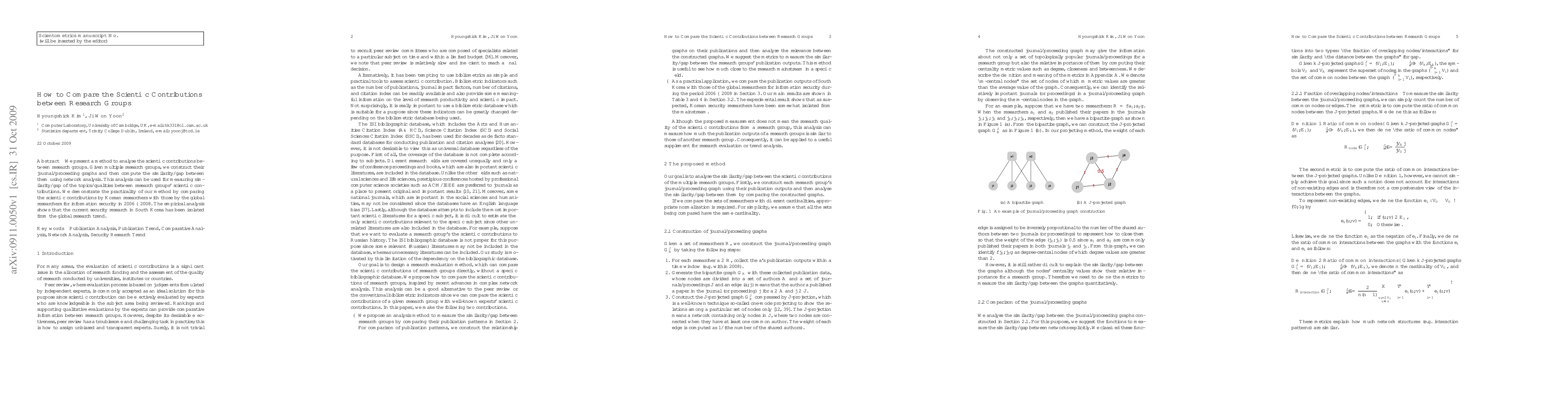 This paper proposes a method to analyze and compare scientific contributions between research groups using network analysis of their publication graphs. It demonstrates the method by comparing Korean and global information security research from 2006-2008, revealing South Korea's research has been isolated from global trends.