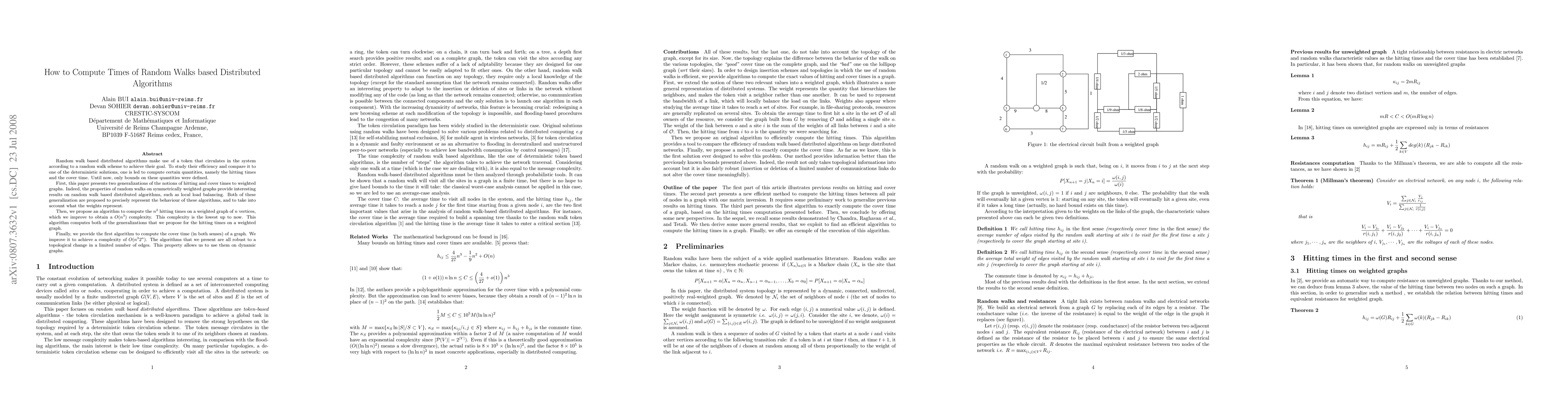 Random walk based distributed algorithms make use of a token that circulates in the system according to a random walk scheme to achieve their goal. To study their efficiency and compare it to one of the deterministic solutions, one is led to compute certain quantities, namely the hitting times and the cover time. Until now, only bounds on these quantities were defined. First, this paper presents two generalizations of the notions of hitting and cover times to weighted graphs. Indeed, the properties of random walks on symmetrically weighted graphs provide interesting results on random walk based distributed algorithms, such as local load balancing. Both of these generalization are proposed to precisely represent the behaviour of these algorithms, and to take into account what the weights represent. Then, we propose an algorithm to compute the n^2 hitting times on a weighted graph of n vertices, which we improve to obtain a O(n^3) complexity. This complexity is the lowest up to now. This algorithm computes both of the generalizations that we propose for the hitting times on a weighted graph. Finally, we provide the first algorithm to compute the cover time (in both senses) of a graph. We improve it to achieve a complexity of O(n^3 2^n). The algorithms that we present are all robust to a topological change in a limited number of edges. This property allows us to use them on dynamic graphs.