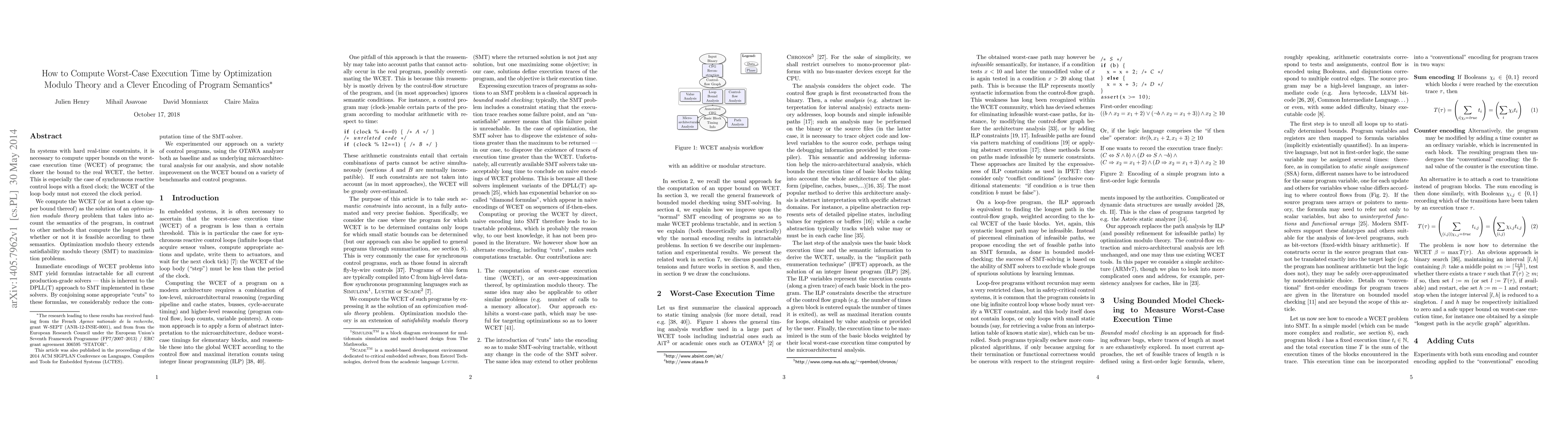 In systems with hard real-time constraints, it is necessary to compute upper bounds on the worst-case execution time (WCET) of programs; the closer the bound to the real WCET, the better. This is especially the case of synchronous reactive control loops with a fixed clock; the WCET of the loop body must not exceed the clock period. We compute the WCET (or at least a close upper bound thereof) as the solution of an optimization modulo theory problem that takes into account the semantics of the program, in contrast to other methods that compute the longest path whether or not it is feasible according to these semantics. Optimization modulo theory extends satisfiability modulo theory (SMT) to maximization problems. Immediate encodings of WCET problems into SMT yield formulas intractable for all current production-grade solvers; this is inherent to the DPLL(T) approach to SMT implemented in these solvers. By conjoining some appropriate "cuts" to these formulas, we considerably reduce the computation time of the SMT-solver. We experimented our approach on a variety of control programs, using the OTAWA analyzer both as baseline and as underlying microarchitectural analysis for our analysis, and show notable improvement on the WCET bound on a variety of benchmarks and control programs.