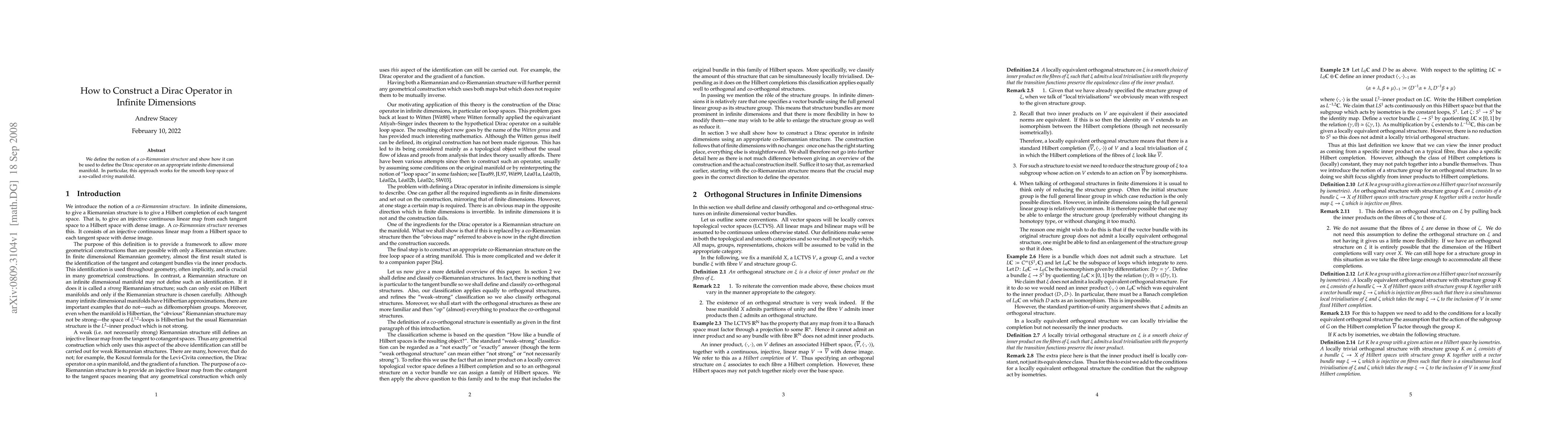 We define the notion of a co-Riemannian structure and show how it can be used to define the Dirac operator on an appropriate infinite dimensional manifold. In particular, this approach works for the smooth loop space of a so-called string manifold.