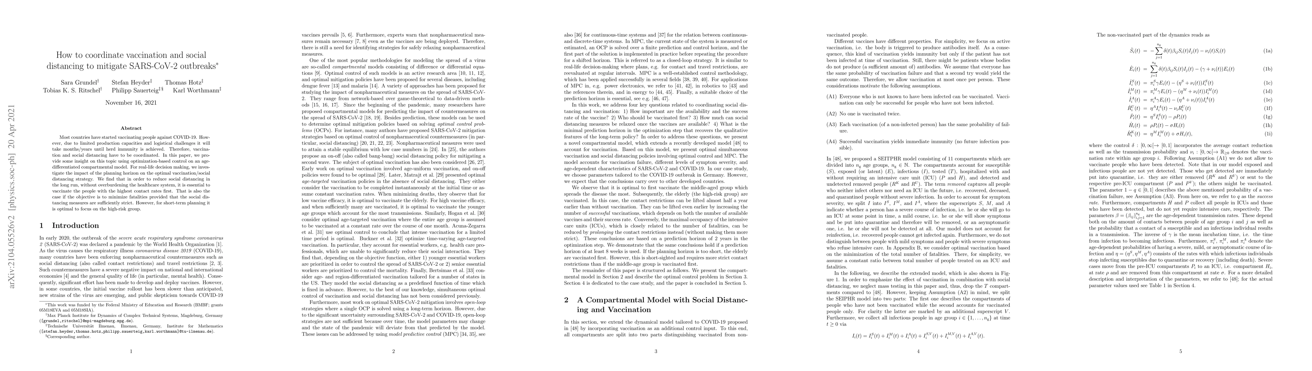 This paper explores the coordination of vaccination and social distancing to mitigate SARS-CoV-2 outbreaks using an optimization-based control model. It finds that prioritizing high-contact individuals for vaccination is crucial for long-term reduction in social distancing, while short-term strategies should focus on high-risk groups.