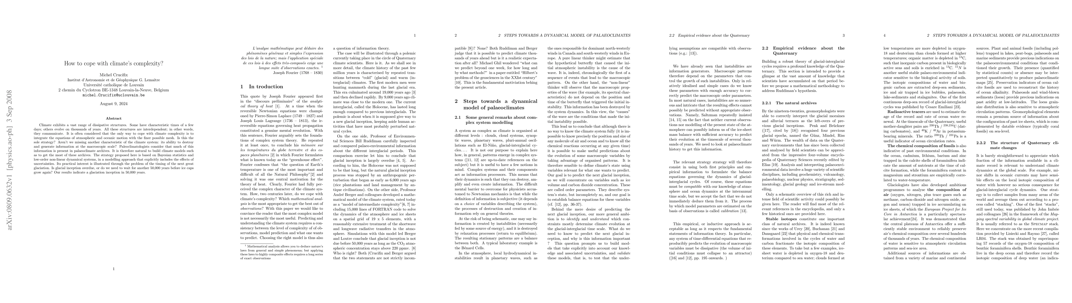 Climate exhibits a vast range of dissipative structures. Some have characteristic times of a few days; others evolve on thousands of years. All these structures are interdependent; in other words, they communicate. It is often considered that the only way to cope with climate complexity is to integrate the equations of atmospheric and oceanic motion with the finer possible mesh. Is this the sole strategy? Aren't we missing another characteristic of the climate system: its ability to destroy and generate information at the macroscopic scale? Paleoclimatologists consider that much of this information is present in palaeoclimate archives. It is therefore natural to build climate models such as to get the most of these archives. The strategy proposed here is based on Bayesian statistics and low-order non-linear dynamical systems, in a modelling approach that explicitly includes the effects of uncertainties. Its practical interest is illustrated through the problem of the timing of the next great glaciation. Is glacial inception overdue, or do we need to wait for another 50,000 years before ice caps grow again? Our results indicate a glaciation inception in 50,000 years.