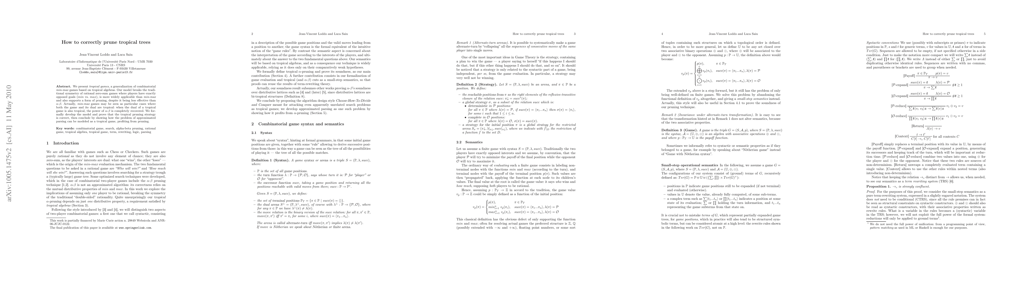 This paper introduces tropical games, a generalization of combinatorial min-max games based on tropical algebras, which breaks the traditional symmetry of rational zero-sum games. It proposes a pruning strategy for these games, though less effective than alpha-beta, and demonstrates its correctness through formal development and application to the problem of approximated parsing.