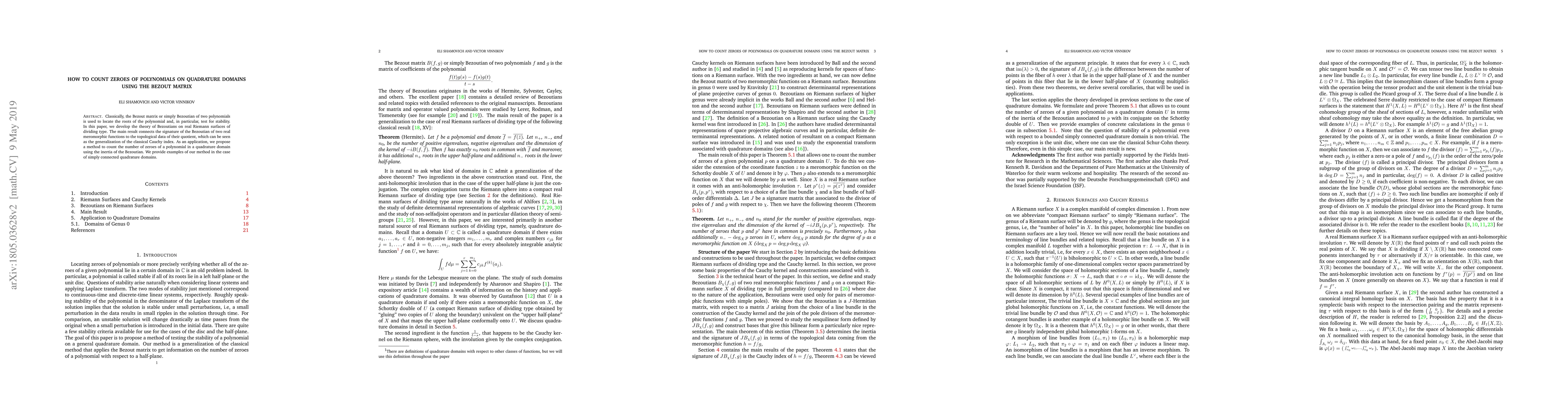 Classically, the Bezout matrix or simply Bezoutian of two polynomials is used to locate the roots of the polynomial and, in particular, test for stability. In this paper, we develop the theory of Bezoutians on real Riemann surfaces of dividing type. The main result connects the signature of the Bezoutian of two real meromorphic functions to the topological data of their quotient, which can be seen as the generalization of the classical Cauchy index. As an application, we propose a method to count the number of zeroes of a polynomial in a quadrature domain using the inertia of the Bezoutian. We provide examples of our method in the case of simply connected quadrature domains.