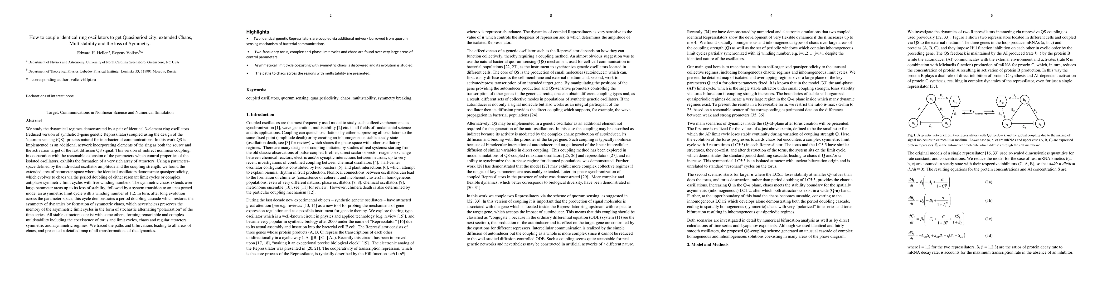 We study the dynamical regimes demonstrated by a pair of identical 3-element ring oscillators (reduced version of synthetic 3-gene genetic Repressilator) coupled using the design of the "quorum sensing (QS)" process natural for interbacterial communications. In this work QS is implemented as an additional network incorporating elements of the ring as both the source and the activation target of the fast diffusion QS signal. This version of indirect nonlinear coupling, in cooperation with the reasonable extension of the parameters which control properties of the isolated oscillators, exhibits the formation of a very rich array of attractors. Using a parameter-space defined by the individual oscillator amplitude and the coupling strength, we found the extended area of parameter-space where the identical oscillators demonstrate quasiperiodicity, which evolves to chaos via the period doubling of either resonant limit cycles or complex antiphase symmetric limit cycles with five winding numbers. The symmetric chaos extends over large parameter areas up to its loss of stability, followed by a system transition to an unexpected mode: an asymmetric limit cycle with a winding number of 1:2. In turn, after long evolution across the parameter-space, this cycle demonstrates a period doubling cascade which restores the symmetry of dynamics by formation of symmetric chaos, which nevertheless preserves the memory of the asymmetric limit cycles in the form of stochastic alternating "polarization" of the time series. All stable attractors coexist with some others, forming remarkable and complex multistability including the coexistence of torus and limit cycles, chaos and regular attractors, symmetric and asymmetric regimes. We traced the paths and bifurcations leading to all areas of chaos, and presented a detailed map of all transformations of the dynamics.