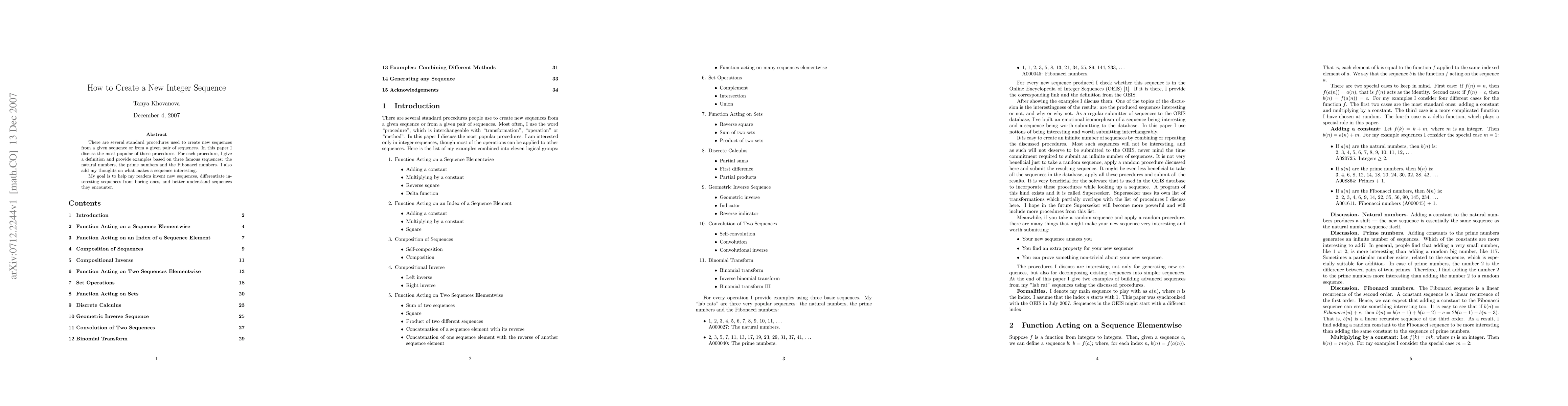 This paper discusses common procedures for creating new integer sequences, including examples from famous sequences like natural numbers, prime numbers, and Fibonacci numbers. It aims to help readers invent new sequences, identify interesting ones, and better understand existing sequences.