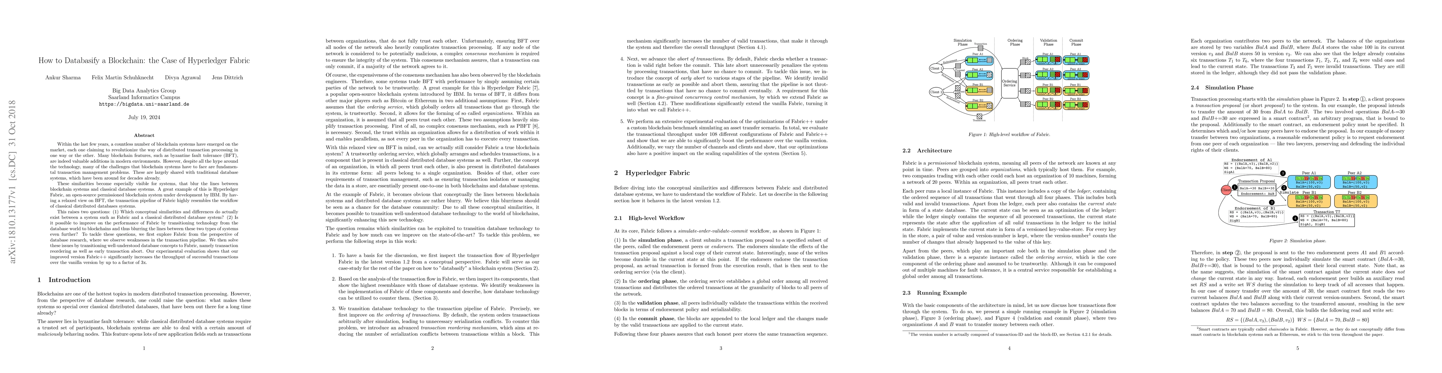 This paper investigates the conceptual similarities and differences between Hyperledger Fabric, a blockchain system, and traditional distributed database systems. It proposes improvements to Fabric by integrating database concepts like transaction reordering and early transaction abort, resulting in a version called Fabric++, which achieves up to three times higher transaction throughput compared to the original Fabric.