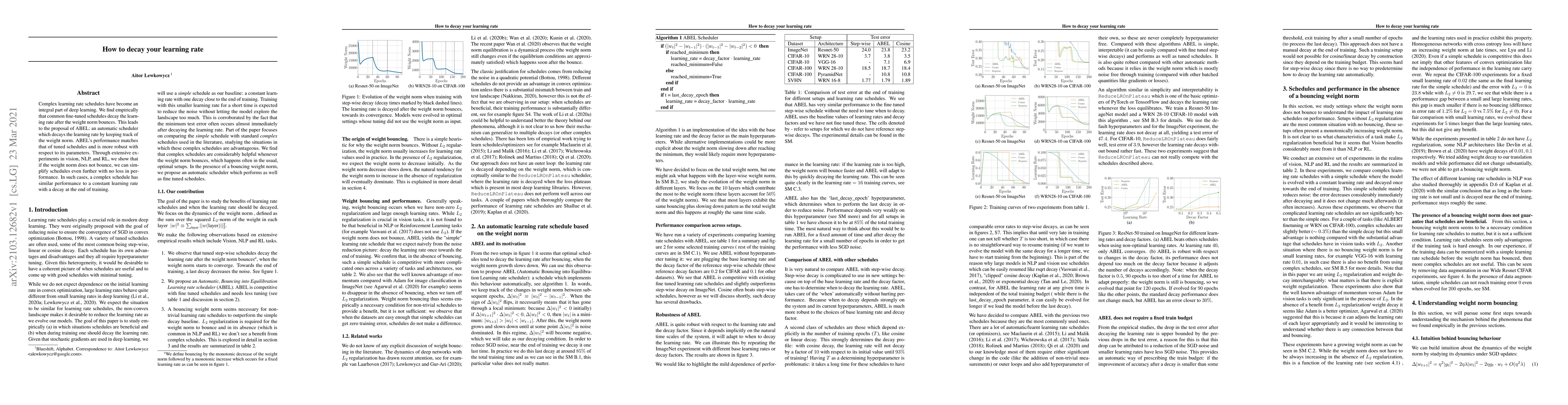 Complex learning rate schedules have become an integral part of deep learning. We find empirically that common fine-tuned schedules decay the learning rate after the weight norm bounces. This leads to the proposal of ABEL: an automatic scheduler which decays the learning rate by keeping track of the weight norm. ABEL's performance matches that of tuned schedules and is more robust with respect to its parameters. Through extensive experiments in vision, NLP, and RL, we show that if the weight norm does not bounce, we can simplify schedules even further with no loss in performance. In such cases, a complex schedule has similar performance to a constant learning rate with a decay at the end of training.