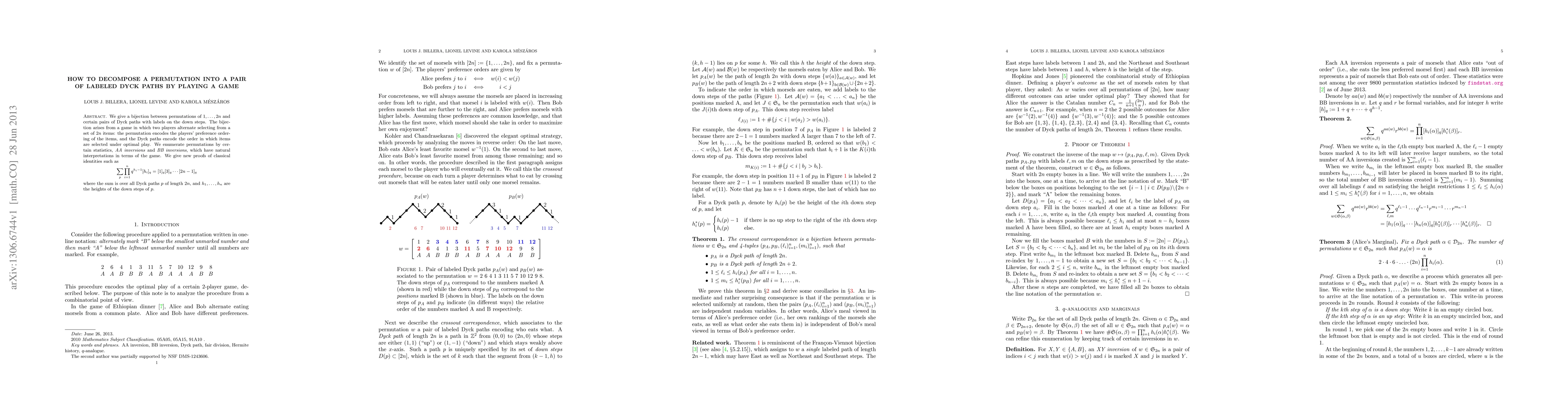 We give a bijection between permutations of length 2n and certain pairs of Dyck paths with labels on the down steps. The bijection arises from a game in which two players alternate selecting from a set of 2n items: the permutation encodes the players' preference ordering of the items, and the Dyck paths encode the order in which items are selected under optimal play. We enumerate permutations by certain statistics, AA inversions and BB inversions, which have natural interpretations in terms of the game. We give new proofs of classical identities such as \sum_p \prod_{i=1}^n q^{h_i -1} [h_i]_q = [1]_q [3]_q ... [2n-1]_q where the sum is over all Dyck paths p of length 2n, and the h_i are the heights of the down steps of p.