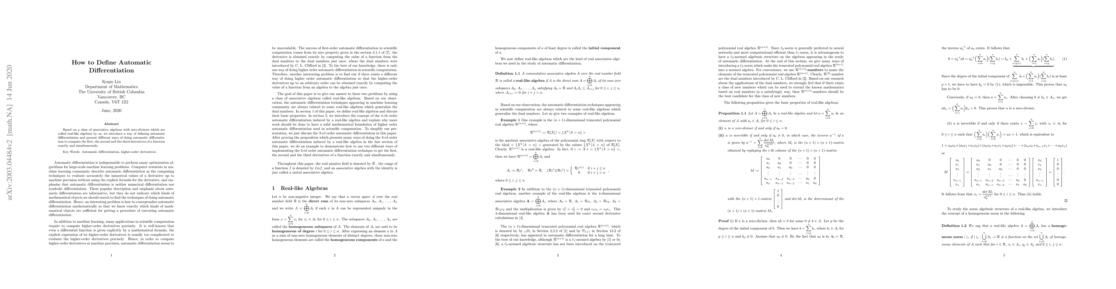 This paper introduces automatic differentiation using real-like algebras, presenting methods to compute first, second, and third derivatives of functions precisely and concurrently. The approach leverages associative algebras with zero-divisors for exact simultaneous differentiation.
