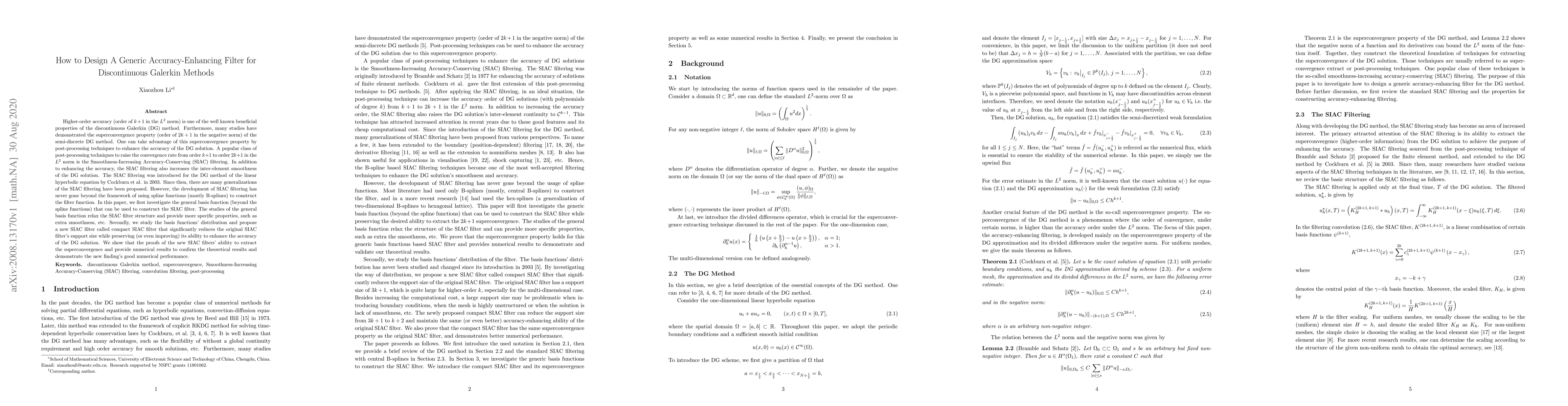 Higher-order accuracy (order of $k+1$ in the $L^2$ norm) is one of the well known beneficial properties of the discontinuous Galerkin (DG) method. Furthermore, many studies have demonstrated the superconvergence property (order of $2k+1$ in the negative norm) of the semi-discrete DG method. One can take advantage of this superconvergence property by post-processing techniques to enhance the accuracy of the DG solution. A popular class of post-processing techniques to raise the convergence rate from order $k+1$ to order $2k+1$ in the $L^2$ norm is the Smoothness-Increasing Accuracy-Conserving (SIAC) filtering. In addition to enhancing the accuracy, the SIAC filtering also increases the inter-element smoothness of the DG solution. The SIAC filtering was introduced for the DG method of the linear hyperbolic equation by Cockburn et al. in 2003. Since then, there are many generalizations of the SIAC filtering have been proposed. However, the development of SIAC filtering has never gone beyond the framework of using spline functions (mostly B-splines) to construct the filter function. In this paper, we first investigate the general basis function (beyond the spline functions) that can be used to construct the SIAC filter. The studies of the general basis function relax the SIAC filter structure and provide more specific properties, such as extra smoothness, etc. Secondly, we study the basis functions' distribution and propose a new SIAC filter called compact SIAC filter that significantly reduces the original SIAC filter's support size while preserving (or even improving) its ability to enhance the accuracy of the DG solution. We show that the proofs of the new SIAC filters' ability to extract the superconvergence and provide numerical results to confirm the theoretical results and demonstrate the new finding's good numerical performance.