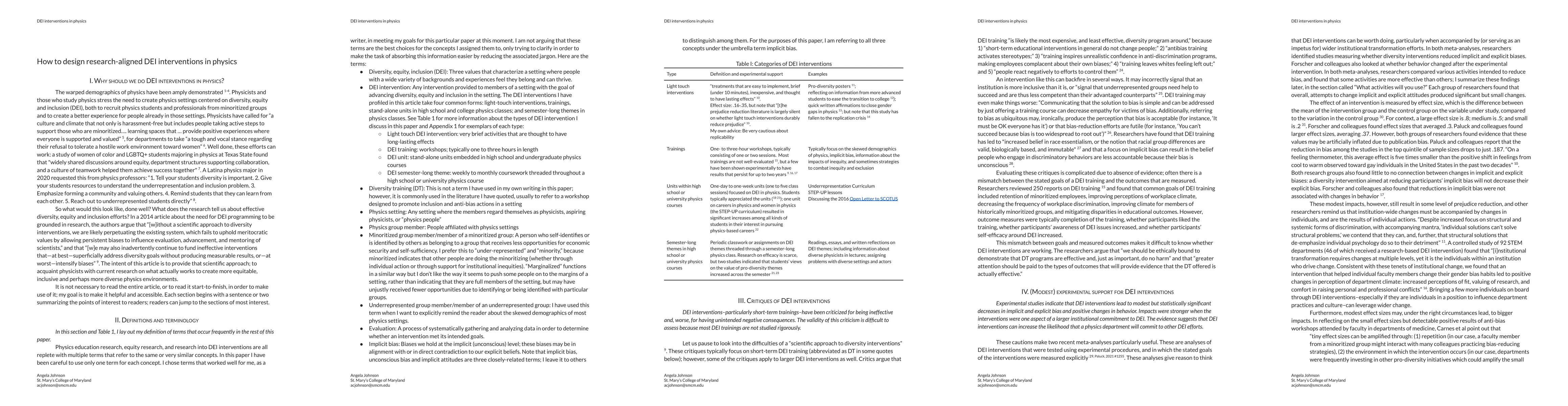 This paper outlines a framework for designing effective diversity, equity, and inclusion (DEI) interventions in physics, addressing critiques and highlighting modest but positive research findings. It proposes six key design questions to ensure interventions are well-justified, voluntary, targeted appropriately, and evaluated effectively.