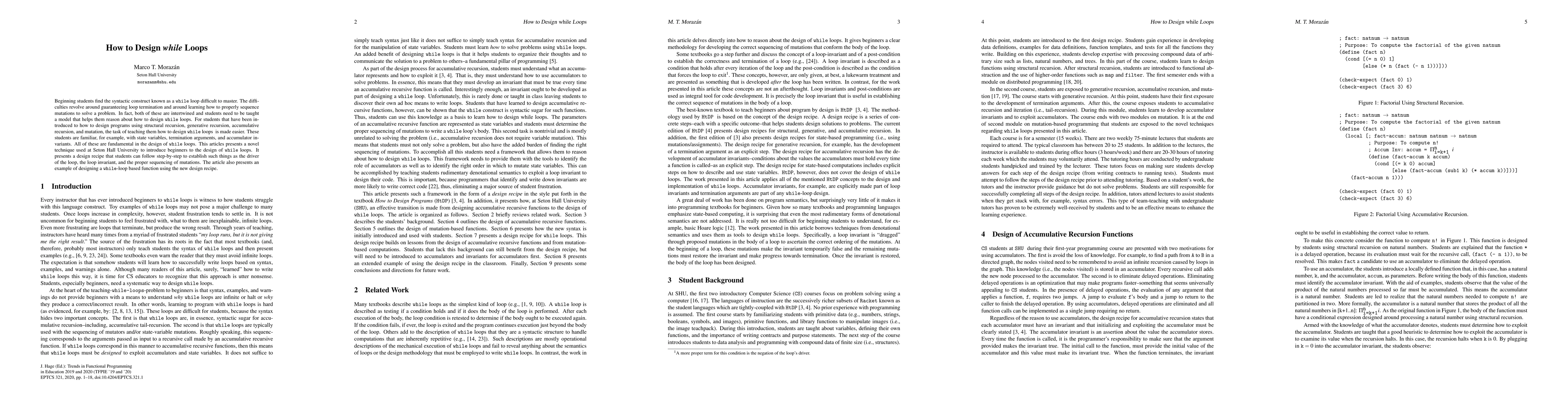 This paper introduces a novel technique to teach beginners how to design while loops by presenting a step-by-step design recipe, emphasizing the importance of loop termination, state variables, and mutation sequencing. The method is demonstrated through an example function at Seton Hall University.