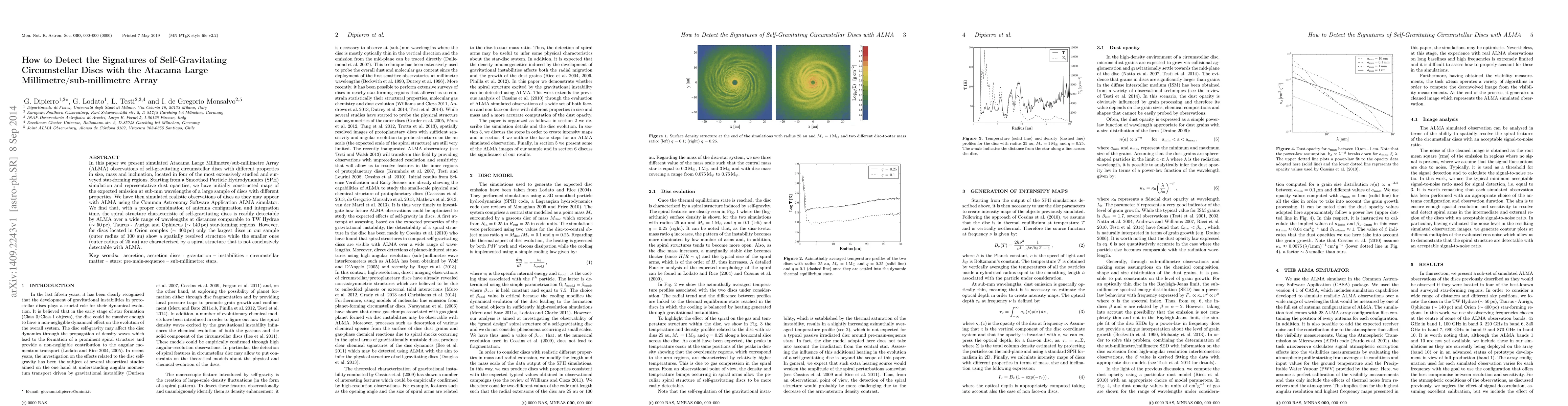 This paper uses ALMA simulations to detect signatures of self-gravitating circumstellar discs in star-forming regions, finding that the spiral structure is detectable for discs in Taurus, Auriga, and Ophiucus but only the largest discs in Orion complex show a resolved structure. Smaller discs in Orion remain undetectable with current ALMA capabilities.