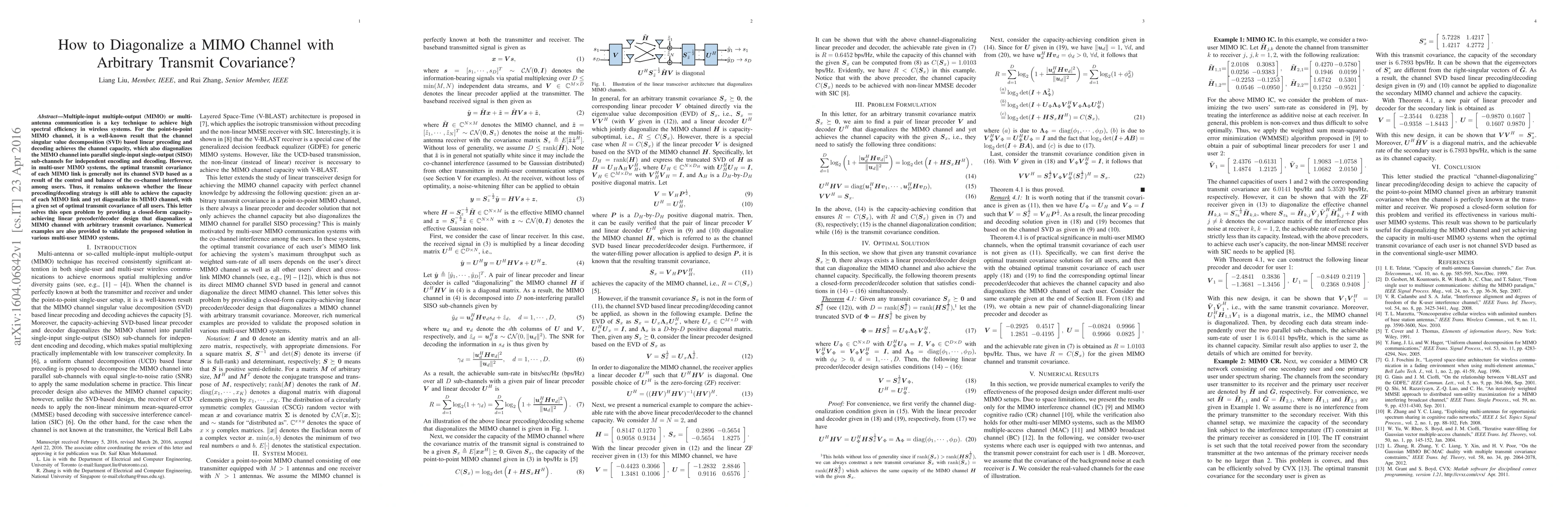 This paper proposes a closed-form linear precoder/decoder design that achieves the capacity and diagonalizes a MIMO channel with arbitrary transmit covariance, addressing the open problem in multi-user MIMO systems. Numerical examples validate the effectiveness of the proposed solution.
