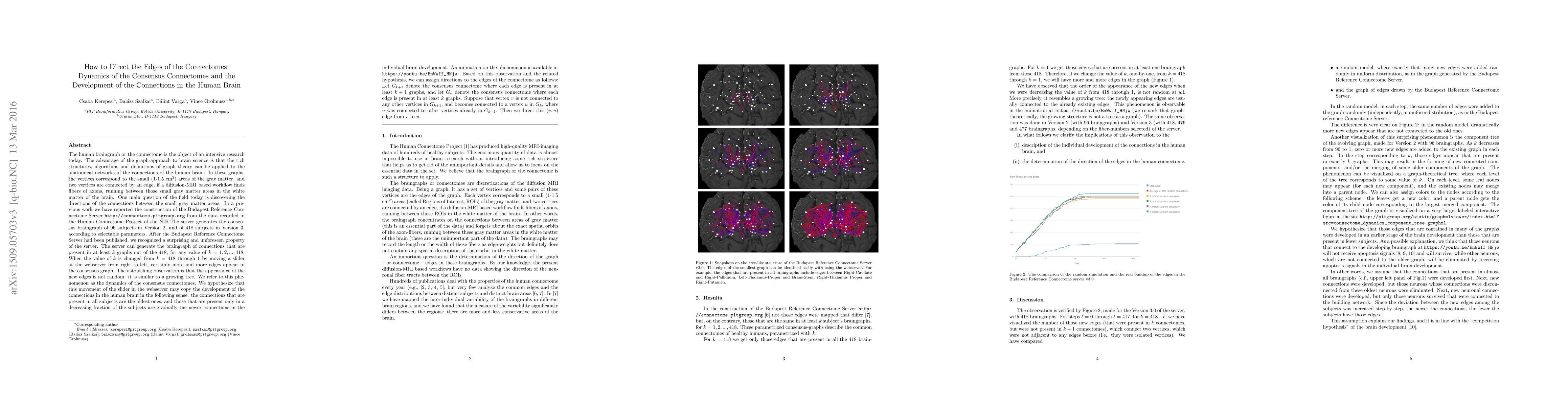 The human connectome is the object of an intensive research today. In these graphs, the vertices correspond to the small areas of the gray matter, and two vertices are connected by an edge, if a diffusion-MRI based workflow finds connections between those areas. One main question of the field is discovering the directions of the edges. In a previous work we have reported the construction of the Budapest Reference Connectome Server http://connectome.pitgroup.org from the data recorded in the Human Connectome Project of the NIH. After the server had been published, we recognized a surprising and unforeseen property of it: The server can generate the braingraph of connections that are present in at least $k$ graphs out of the 418, for any value of $k=1,2,...,418$. When the value of $k$ is changed from $k=418$ through 1 by moving a slider at the webserver from right to left, more and more edges appear in the consensus graph. The astonishing observation is that the appearance of the new edges is not random: it is similar to a growing tree. We hypothesize that this movement of the slider in the webserver may copy the development of the connections in the human brain in the following sense: the connections that are present in all subjects are the oldest ones, and those that are present in a decreasing fraction of subjects are gradually the newer connections in the individual brain development. An animation on the phenomenon is available at https://youtu.be/EnWwIf_HNjw. Based on this hypothesis, we can assign directions to the edges of the connectome as follows: Let $G_i$ denote the consensus connectome where each edge is present in at least $i$ graphs. Suppose that vertex $v$ is isolated in $G_{k+1}$, and becomes connected to a vertex $u$ in $G_k$, where $u$ was connected to other vertices already in $G_{k+1}$. Then we direct this $(v,u)$ edge from $v$ to $u$.
