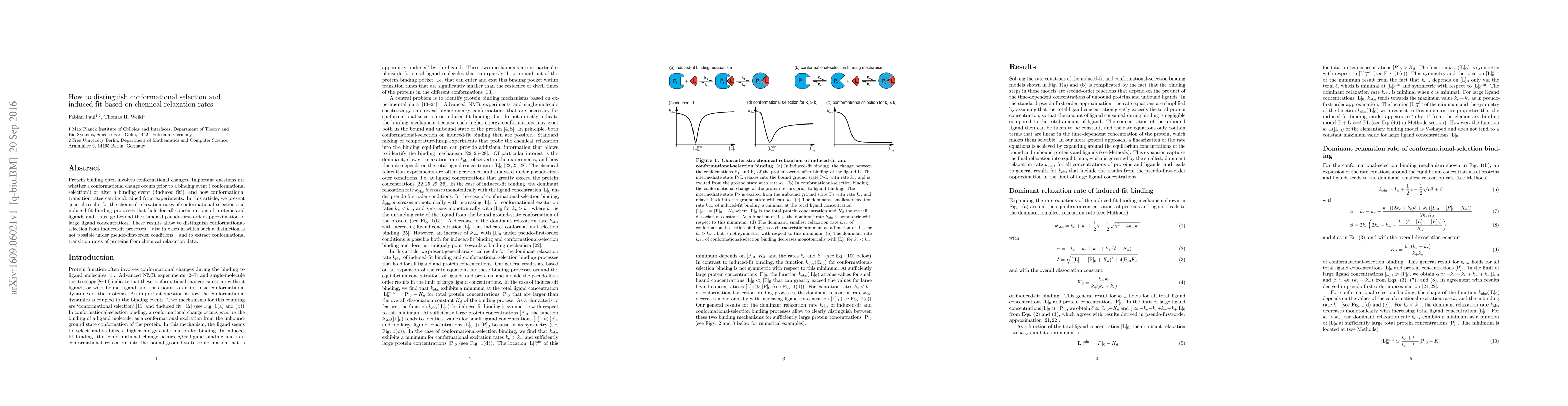 This paper presents general results for chemical relaxation rates to distinguish between conformational selection and induced fit in protein binding processes, applicable across all protein and ligand concentrations, and provides a method to extract conformational transition rates from experimental data.