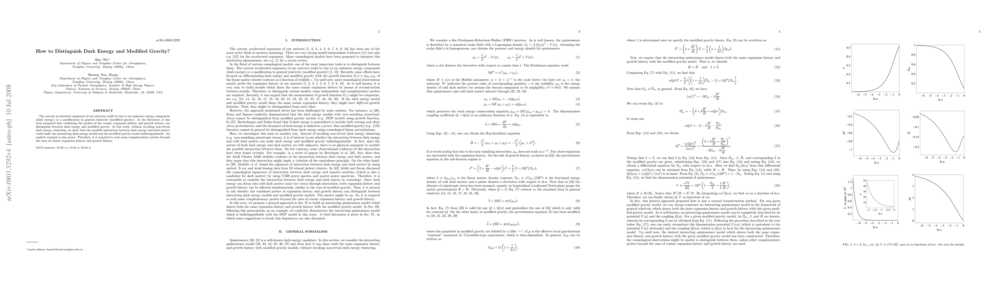 This paper discusses the challenge of distinguishing between dark energy and modified gravity as explanations for the universe's accelerated expansion. It concludes that the interaction between dark energy and dark matter can make these models indistinguishable, necessitating the search for additional observational probes beyond cosmic expansion and growth history.