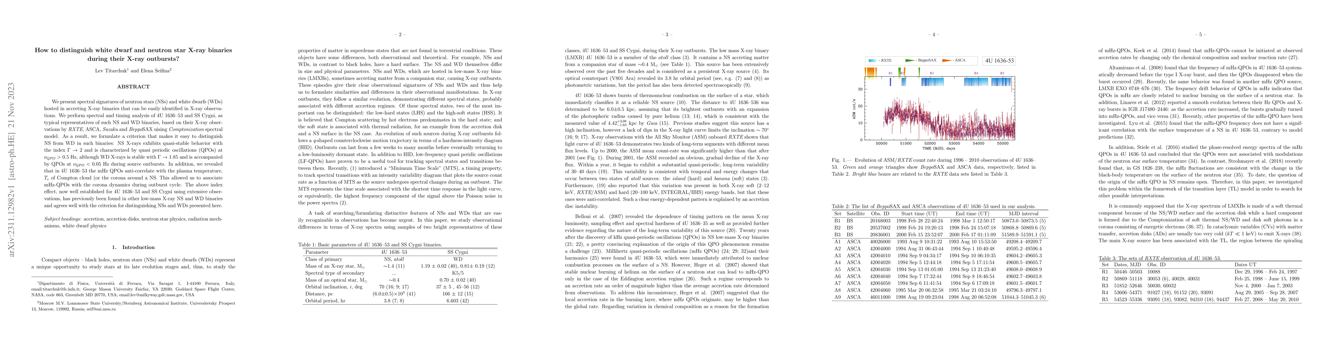 This paper presents spectral and timing signatures to distinguish neutron star (NS) from white dwarf (WD) X-ray binaries during outbursts. It identifies NSs by quasi-stable behavior with $\Gamma\to2$ and QPOs at $\nu_{QPO} >0.5$~Hz, while WDs exhibit stable $\Gamma \to1.85$ and QPOs at $\nu_{QPO}<0.05$~Hz.