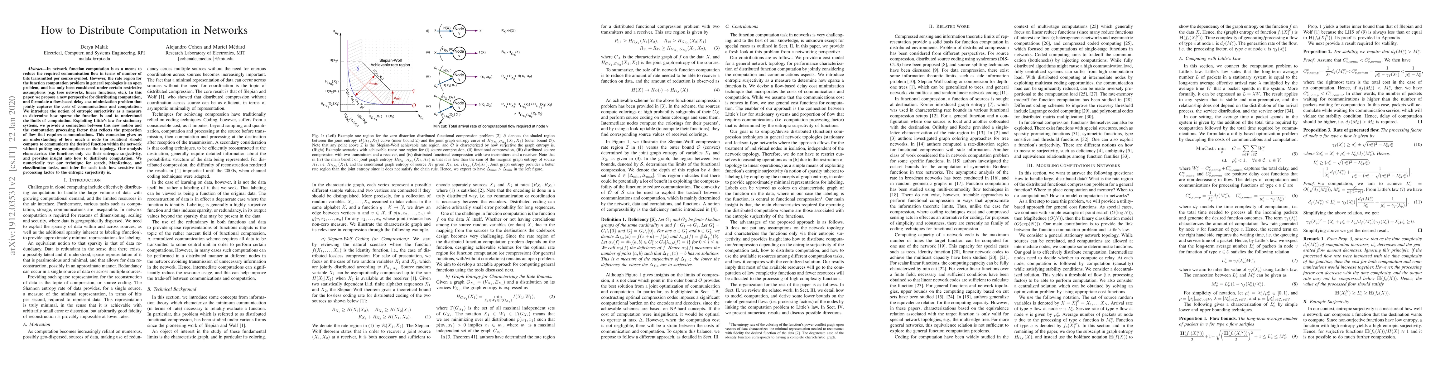 A new approach to distributing computation in networks is proposed, which minimizes delay cost by jointly considering communication flow and computation, and characterizes the functions via entropic surjectivity, providing insight into how much a node should compute.