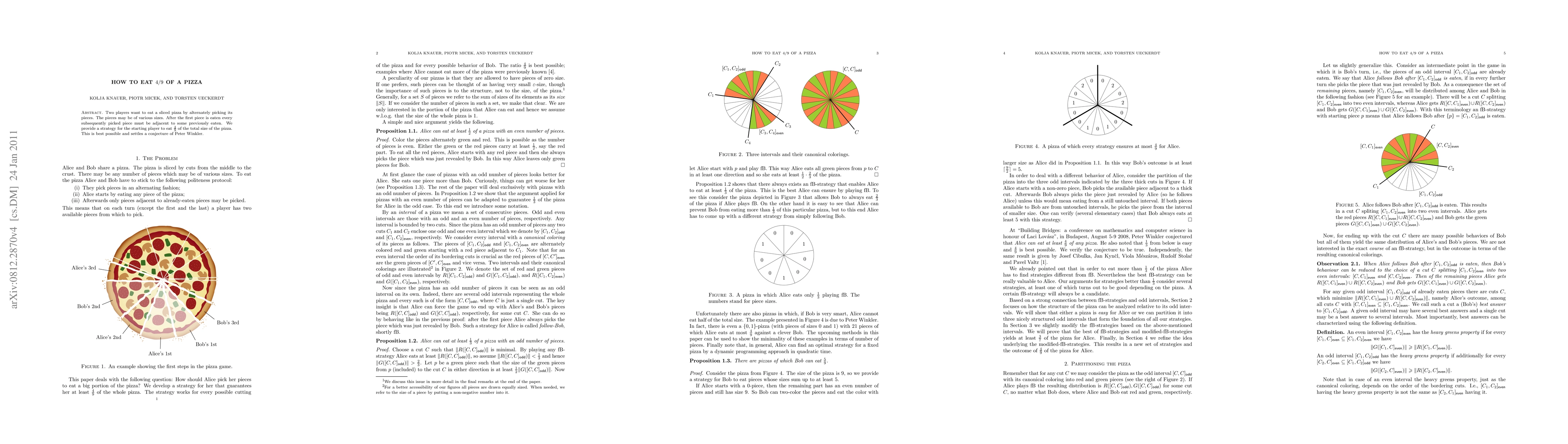 Summary: This paper presents a strategy for the first player to ensure they take 4/9 of a pizza sliced by radial cuts, proving it is the optimal outcome and resolving a conjecture by Peter Winkler. The strategy involves carefully selecting pieces that are adjacent to previously taken ones.