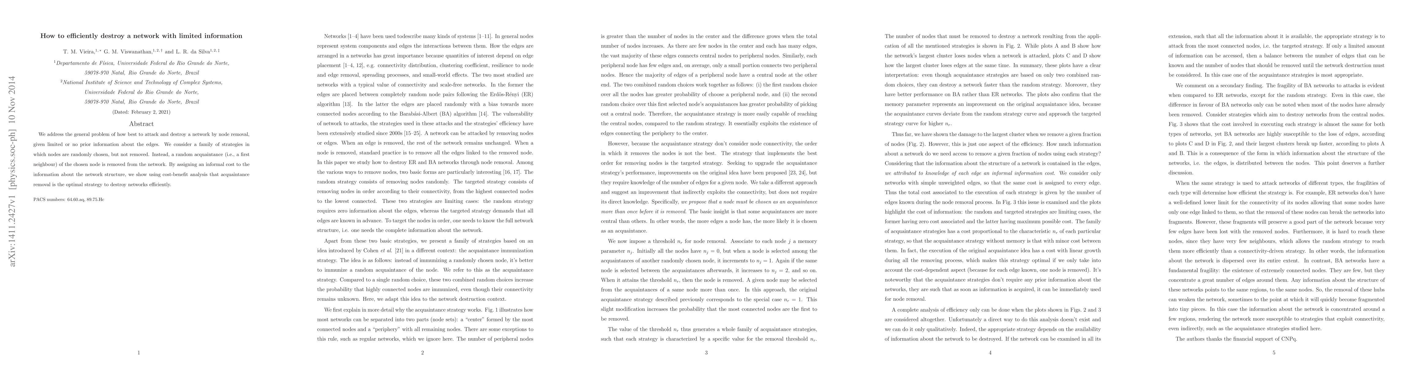 We address the general problem of how best to attack and destroy a network by node removal, given limited or no prior information about the edges. We consider a family of strategies in which nodes are randomly chosen, but not removed. Instead, a random acquaintance (i.e., a first neighbour) of the chosen node is removed from the network. By assigning an informal cost to the information about the network structure, we show using cost-benefit analysis that acquaintance removal is the optimal strategy to destroy networks efficiently.