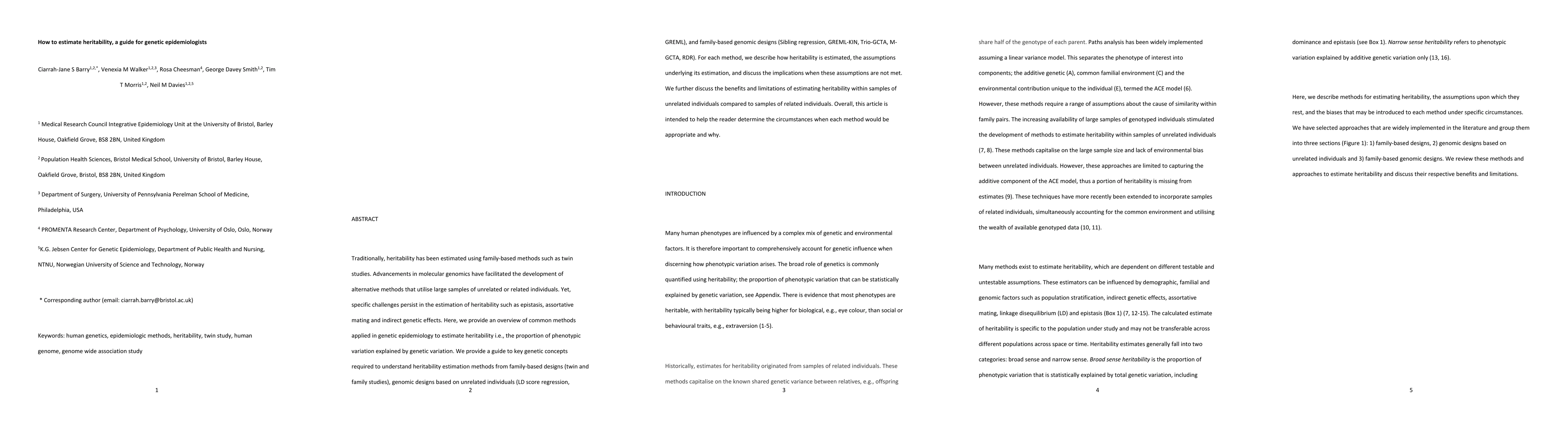 This guide for epidemiologists explains common heritability estimation methods, including family-based (twin, family studies) and genomic designs (LD score regression, GREML). It outlines each method's heritability estimation, assumptions, and implications when assumptions are violated, aiming to help readers choose appropriate methods based on their circumstances.