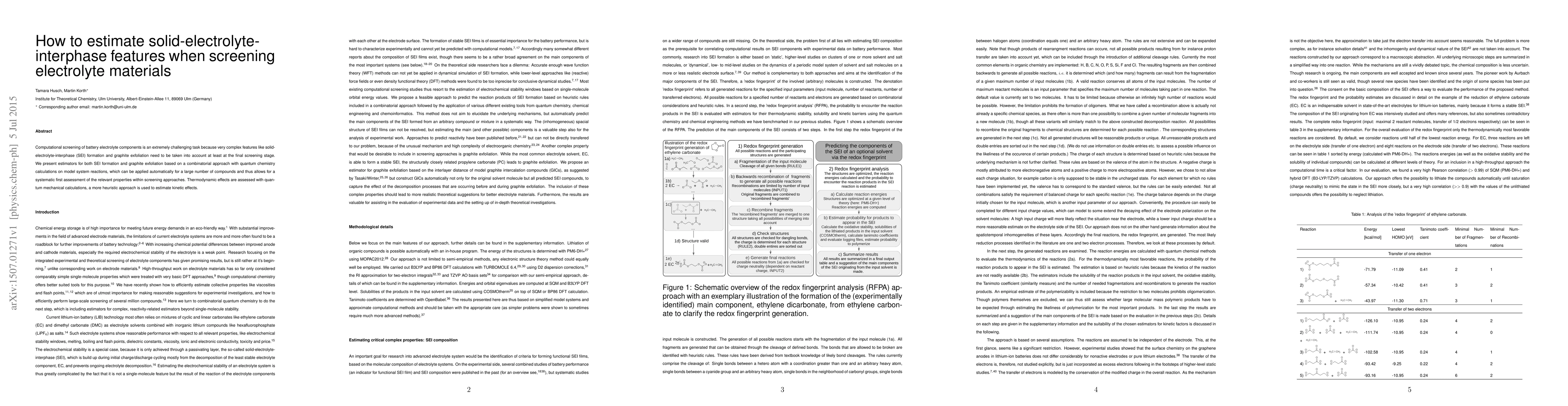 Computational screening of battery electrolyte components is an extremely challenging task because very complex features like solidelectrolyte-interphase (SEI) formation and graphite exfoliation need to be taken into account at least at the final screening stage. We present estimators for both SEI formation and graphite exfoliation based on a combinatorial approach with quantum chemistry calculations on model system reactions, which can be applied automatically for a large number of compounds and thus allows for a systematic first assessment of the relevant properties within screening approaches. Thermodynamic effects are assessed with quantum mechanical calculations, a more heuristic approach is used to estimate kinetic effects.