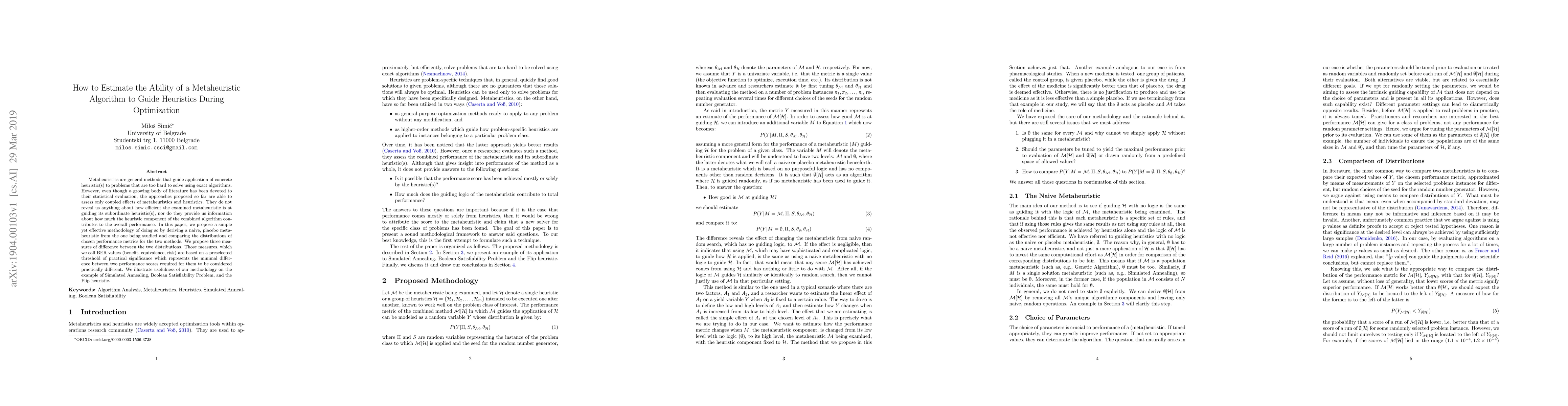 Metaheuristics are general methods that guide application of concrete heuristic(s) to problems that are too hard to solve using exact algorithms. However, even though a growing body of literature has been devoted to their statistical evaluation, the approaches proposed so far are able to assess only coupled effects of metaheuristics and heuristics. They do not reveal us anything about how efficient the examined metaheuristic is at guiding its subordinate heuristic(s), nor do they provide us information about how much the heuristic component of the combined algorithm contributes to the overall performance. In this paper, we propose a simple yet effective methodology of doing so by deriving a naive, placebo metaheuristic from the one being studied and comparing the distributions of chosen performance metrics for the two methods. We propose three measures of difference between the two distributions. Those measures, which we call BER values (benefit, equivalence, risk) are based on a preselected threshold of practical significance which represents the minimal difference between two performance scores required for them to be considered practically different. We illustrate usefulness of our methodology on the example of Simulated Annealing, Boolean Satisfiability Problem, and the Flip heuristic.