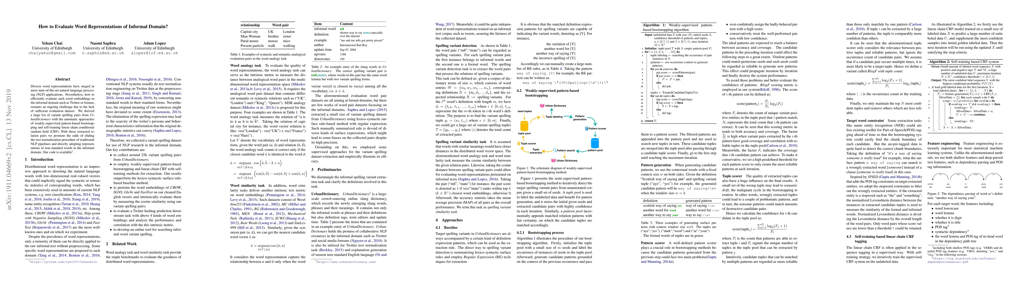 Diverse word representations have surged in most state-of-the-art natural language processing (NLP) applications. Nevertheless, how to efficiently evaluate such word embeddings in the informal domain such as Twitter or forums, remains an ongoing challenge due to the lack of sufficient evaluation dataset. We derived a large list of variant spelling pairs from UrbanDictionary with the automatic approaches of weakly-supervised pattern-based bootstrapping and self-training linear-chain conditional random field (CRF). With these extracted relation pairs we promote the odds of eliding the text normalization procedure of traditional NLP pipelines and directly adopting representations of non-standard words in the informal domain. Our code is available.