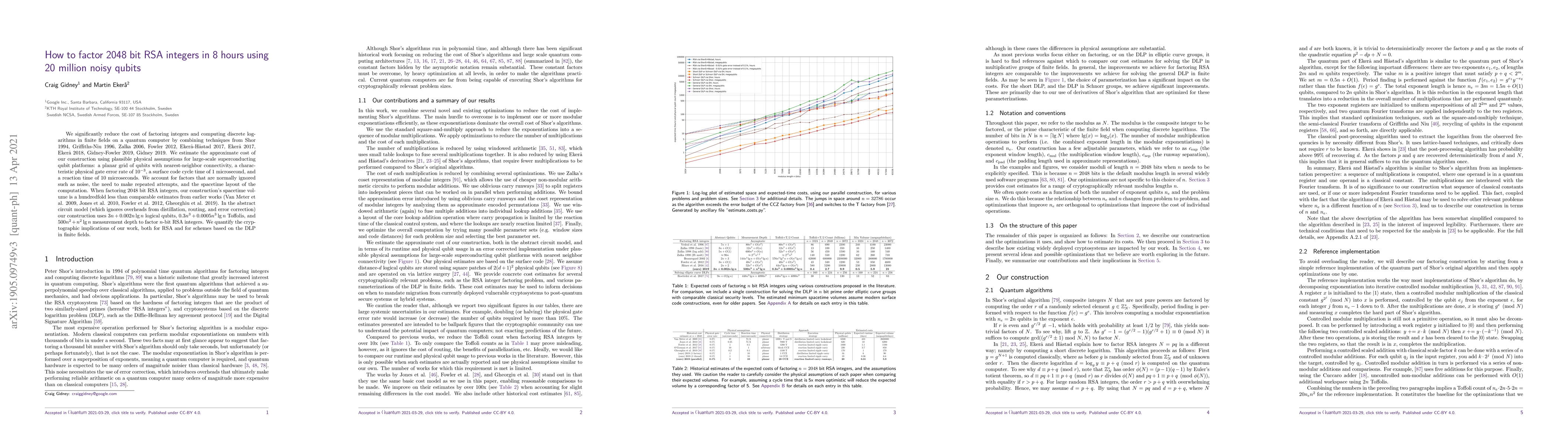 This paper presents a novel quantum algorithm to factor 2048-bit RSA integers within 8 hours using 20 million noisy qubits, significantly reducing computational costs and spacetime volume compared to prior estimates. The method integrates multiple quantum computing techniques and considers factors like noise and error correction.