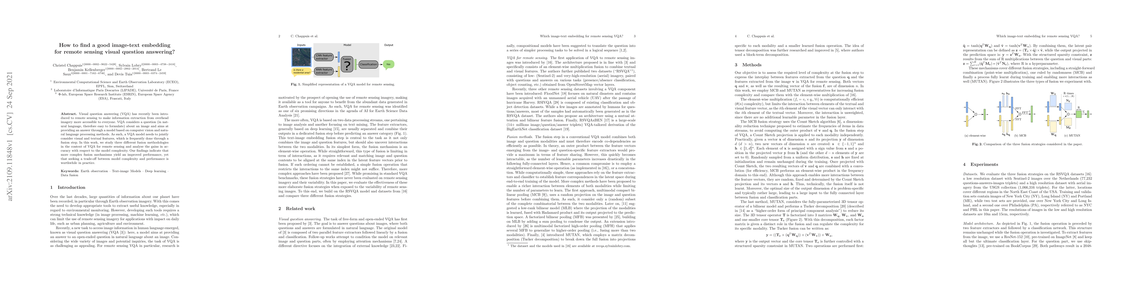This paper investigates three fusion methodologies for visual question answering (VQA) in remote sensing, finding that more complex fusion techniques enhance accuracy but necessitate a balance between complexity and performance. The study highlights the importance of finding an optimal trade-off for practical applications.