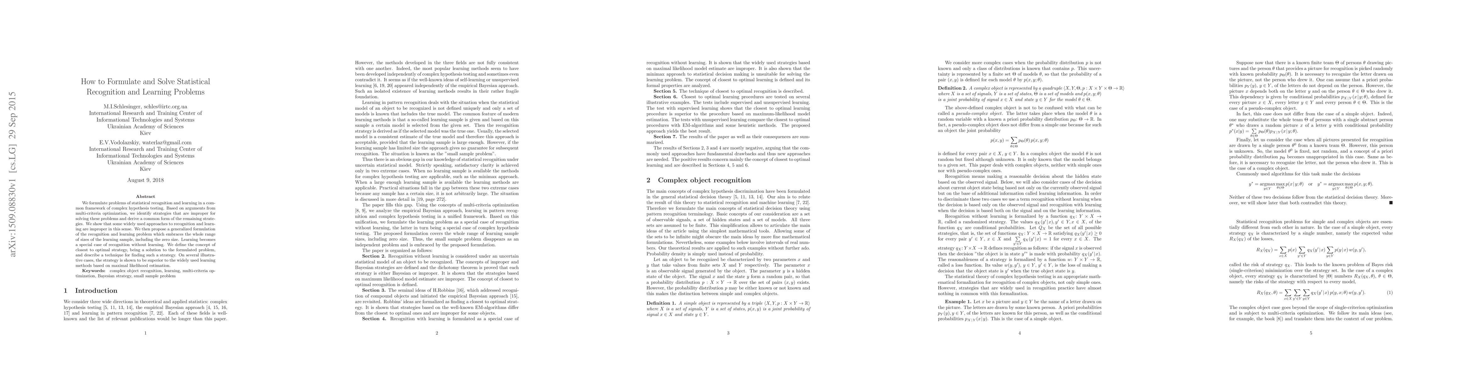 We formulate problems of statistical recognition and learning in a common framework of complex hypothesis testing. Based on arguments from multi-criteria optimization, we identify strategies that are improper for solving these problems and derive a common form of the remaining strategies. We show that some widely used approaches to recognition and learning are improper in this sense. We then propose a generalized formulation of the recognition and learning problem which embraces the whole range of sizes of the learning sample, including the zero size. Learning becomes a special case of recognition without learning. We define the concept of closest to optimal strategy, being a solution to the formulated problem, and describe a technique for finding such a strategy. On several illustrative cases, the strategy is shown to be superior to the widely used learning methods based on maximal likelihood estimation.