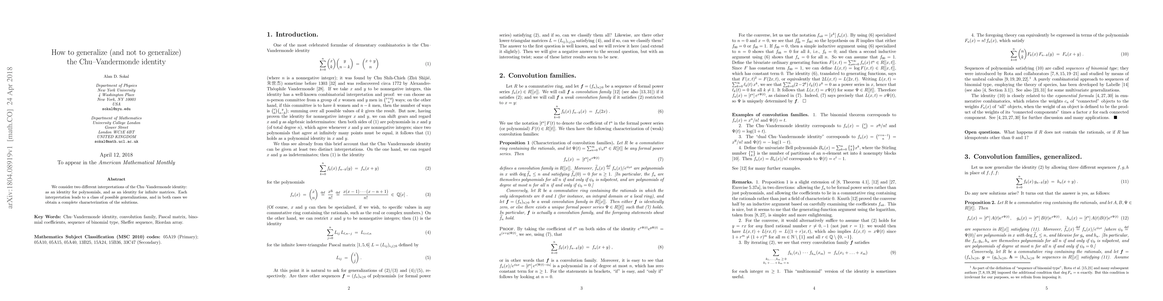 We consider two different interpretations of the Chu--Vandermonde identity: as an identity for polynomials, and as an identity for infinite matrices. Each interpretation leads to a class of possible generalizations, and in both cases we obtain a complete characterization of the solutions.