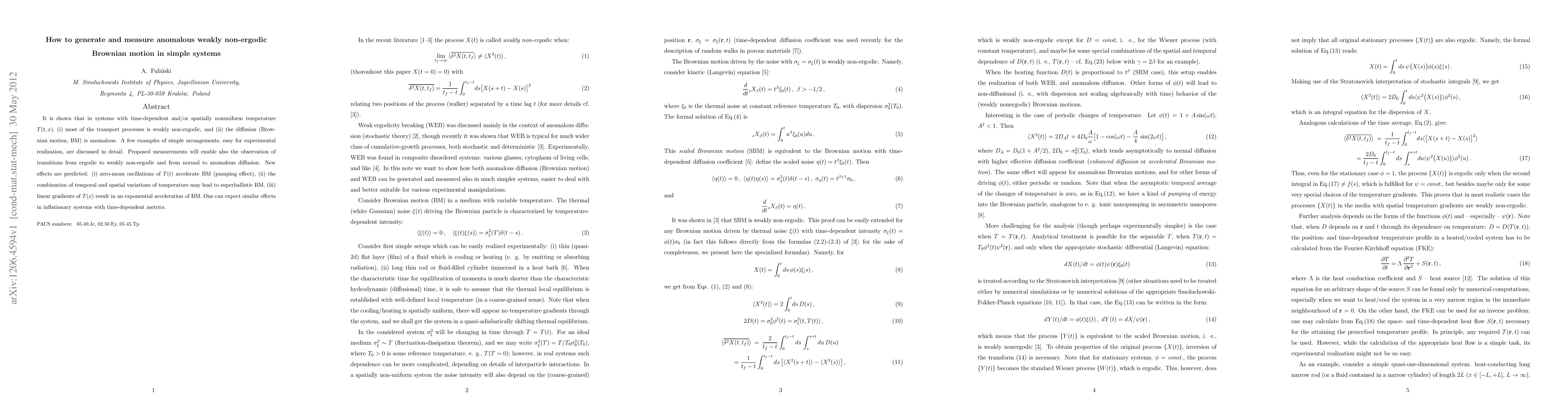 This paper explores the generation and measurement of anomalous weakly non-ergodic Brownian motion in systems with time-dependent and spatially nonuniform temperature. It proposes experimental setups to observe transitions between ergodic and non-ergodic states and normal and anomalous diffusion.