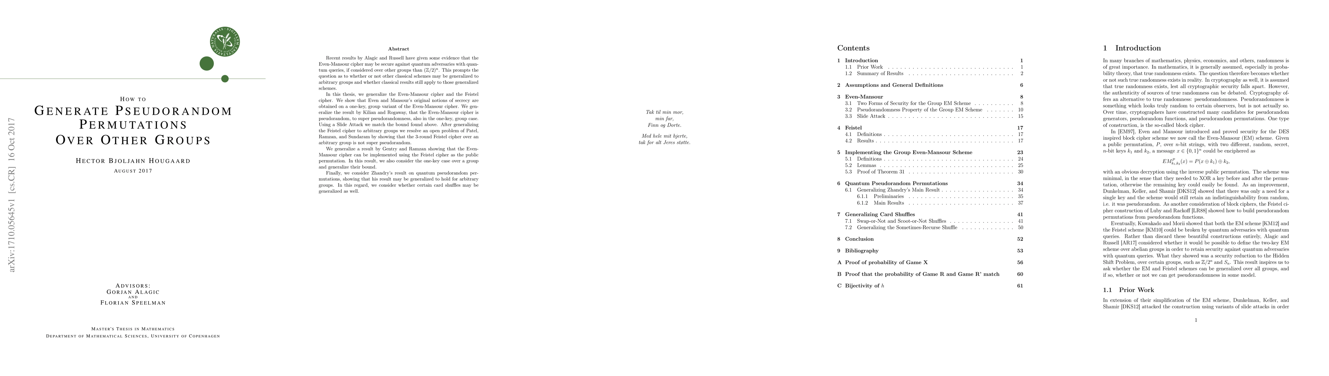 Recent results by Alagic and Russell have given some evidence that the Even-Mansour cipher may be secure against quantum adversaries with quantum queries, if considered over other groups than $(\mathbb{Z}/2)^n$. This prompts the question as to whether or not other classical schemes may be generalized to arbitrary groups and whether classical results still apply to those generalized schemes. In this thesis, we generalize the Even-Mansour cipher and the Feistel cipher. We show that Even and Mansour's original notions of secrecy are obtained on a one-key, group variant of the Even-Mansour cipher. We generalize the result by Kilian and Rogaway, that the Even-Mansour cipher is pseudorandom, to super pseudorandomness, also in the one-key, group case. Using a Slide Attack we match the bound found above. After generalizing the Feistel cipher to arbitrary groups we resolve an open problem of Patel, Ramzan, and Sundaram by showing that the 3-round Feistel cipher over an arbitrary group is not super pseudorandom. We generalize a result by Gentry and Ramzan showing that the Even-Mansour cipher can be implemented using the Feistel cipher as the public permutation. In this result, we also consider the one-key case over a group and generalize their bound. Finally, we consider Zhandry's result on quantum pseudorandom permutations, showing that his result may be generalized to hold for arbitrary groups. In this regard, we consider whether certain card shuffles may be generalized as well.