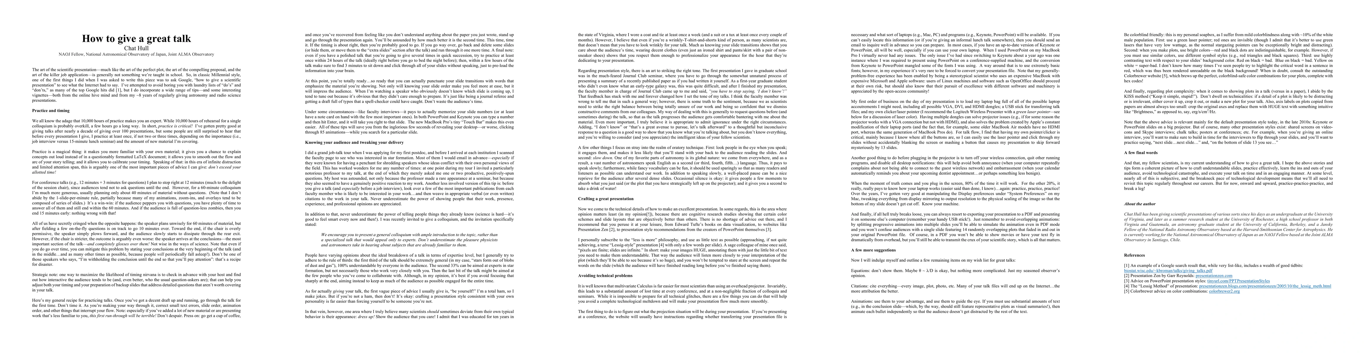 The art of the scientific presentation -- much like the art of the perfect plot, the art of the compelling proposal, and the art of the killer job application -- is generally not something we're taught in school. Therefore, in classic Millennial style, one of the first things I did when I was asked to write this piece was to ask Google, "how to give a scientific presentation," to see what the Internet had to say. I've attempted to avoid boring you with laundry lists of "do's" and "don'ts," as many of the top Google hits did. However, I have incorporated a wide range of tips -- and some interesting vignettes -- both from the online hive mind and from my approximately eight years of regularly giving astronomy and radio-science presentations.
