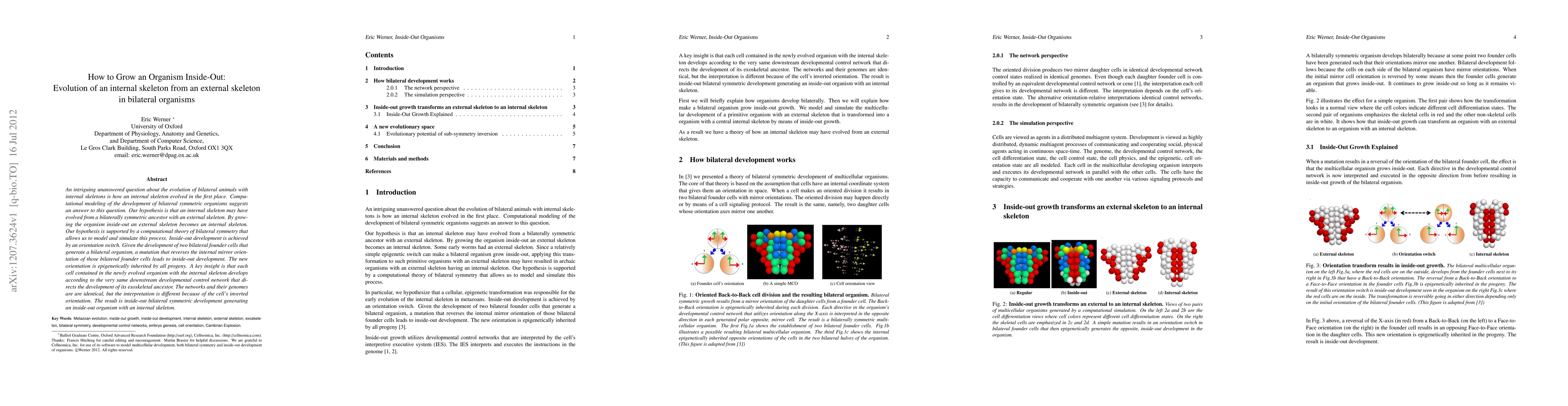 This paper hypothesizes that internal skeletons in bilateral organisms evolved from external skeletons through an inside-out developmental process, facilitated by an orientation switch in bilateral founder cells. Computational modeling supports this theory, showing that the same developmental networks guide both ancestral and evolved organisms, albeit with an inverted orientation.