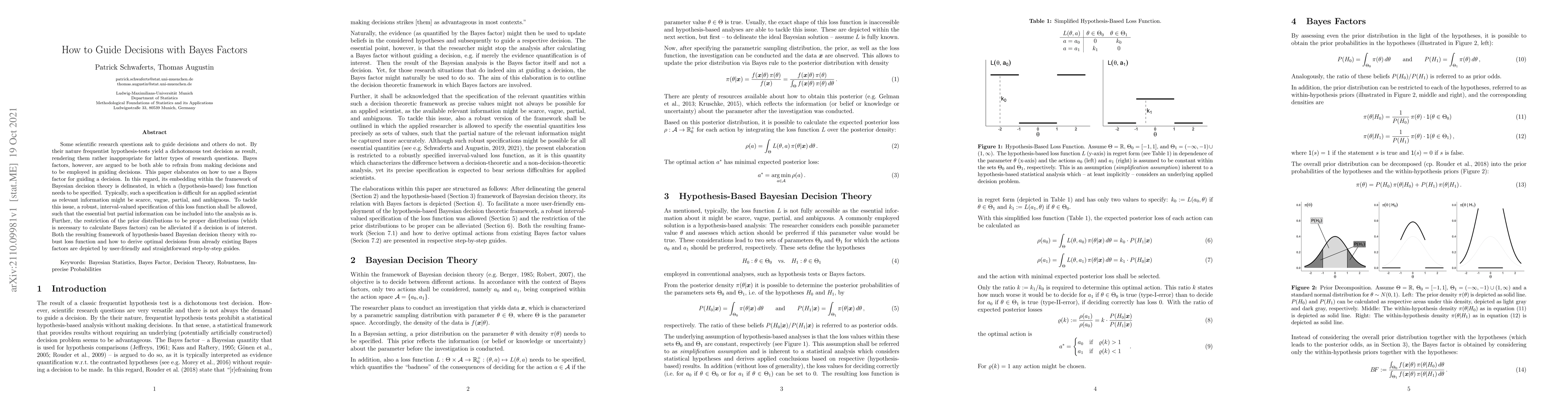 Some scientific research questions ask to guide decisions and others do not. By their nature frequentist hypothesis-tests yield a dichotomous test decision as result, rendering them rather inappropriate for latter types of research questions. Bayes factors, however, are argued to be both able to refrain from making decisions and to be employed in guiding decisions. This paper elaborates on how to use a Bayes factor for guiding a decision. In this regard, its embedding within the framework of Bayesian decision theory is delineated, in which a (hypothesis-based) loss function needs to be specified. Typically, such a specification is difficult for an applied scientist as relevant information might be scarce, vague, partial, and ambiguous. To tackle this issue, a robust, interval-valued specification of this loss function shall be allowed, such that the essential but partial information can be included into the analysis as is. Further, the restriction of the prior distributions to be proper distributions (which is necessary to calculate Bayes factors) can be alleviated if a decision is of interest. Both the resulting framework of hypothesis-based Bayesian decision theory with robust loss function and how to derive optimal decisions from already existing Bayes factors are depicted by user-friendly and straightforward step-by-step guides.