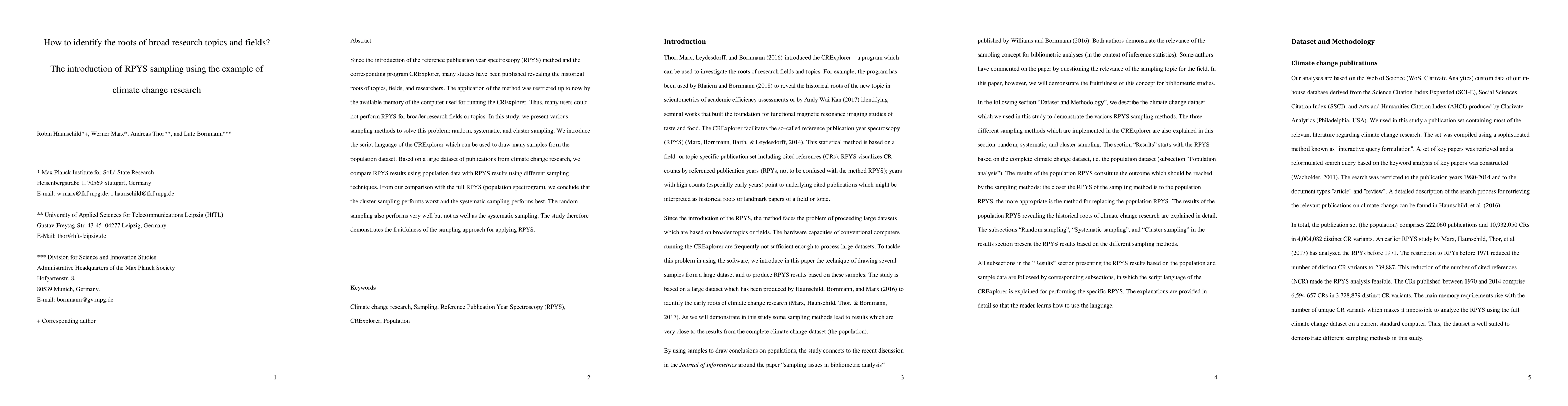Since the introduction of the reference publication year spectroscopy (RPYS) method and the corresponding program CRExplorer, many studies have been published revealing the historical roots of topics, fields, and researchers. The application of the method was restricted up to now by the available memory of the computer used for running the CRExplorer. Thus, many users could not perform RPYS for broader research fields or topics. In this study, we present various sampling methods to solve this problem: random, systematic, and cluster sampling. We introduce the script language of the CRExplorer which can be used to draw many samples from the population dataset. Based on a large dataset of publications from climate change research, we compare RPYS results using population data with RPYS results using different sampling techniques. From our comparison with the full RPYS (population spectrogram), we conclude that the cluster sampling performs worst and the systematic sampling performs best. The random sampling also performs very well but not as well as the systematic sampling. The study therefore demonstrates the fruitfulness of the sampling approach for applying RPYS.